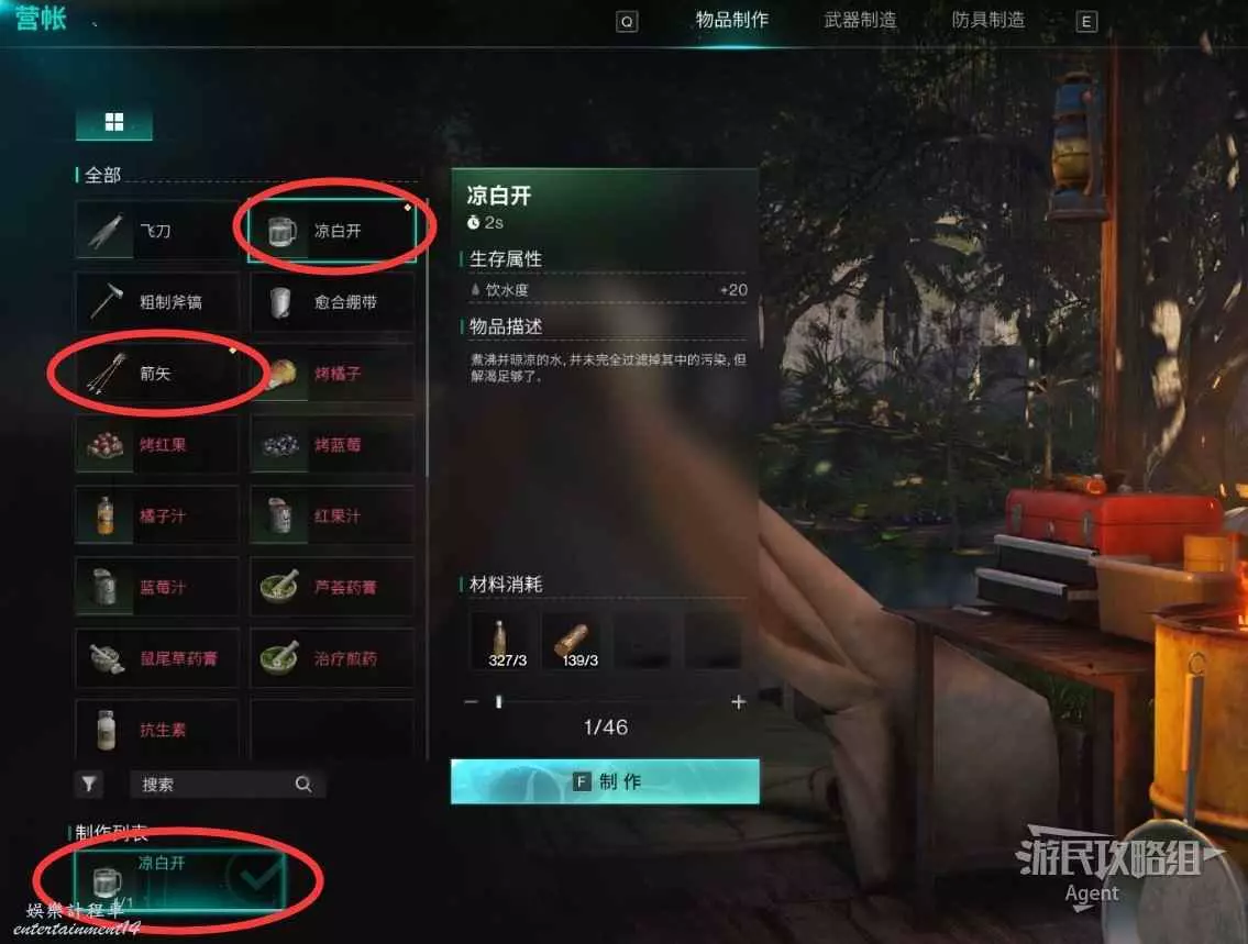 製作涼白開、箭矢、粗制弩。粗制弩在武器製造一欄裡。