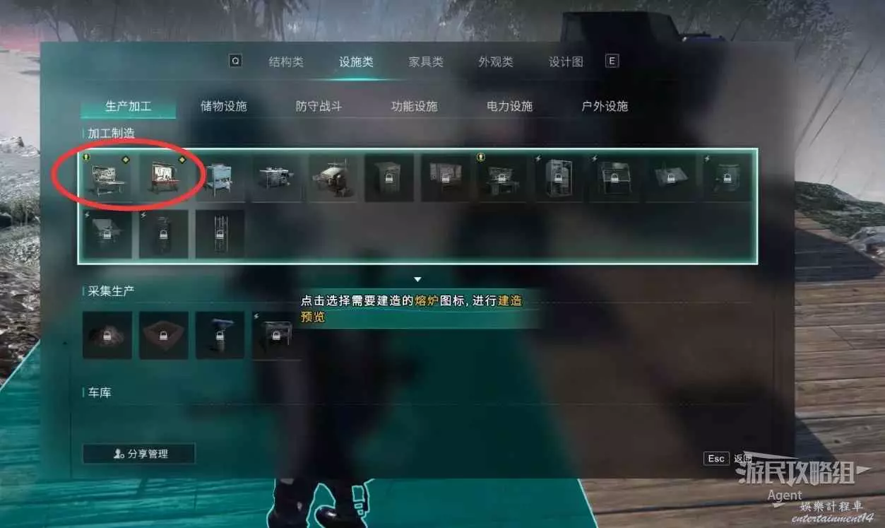 按B進入建造模式,然後按“滑鼠右鍵”打開建造菜單,建造熔爐、拆解台。