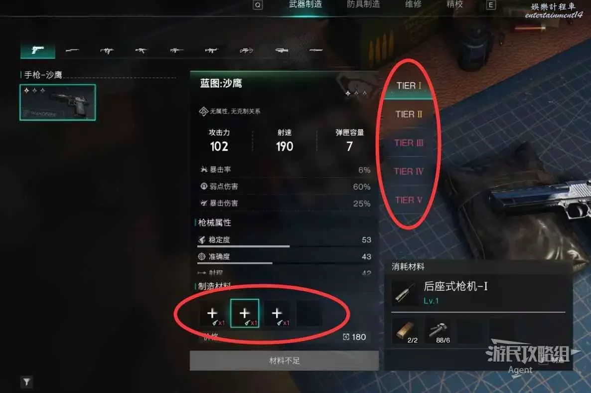 在裝備製作台可以製造已解鎖藍圖的武器裝備,製造時選擇制作品階可以提高武器各項屬性。裝備製作台還可以進行武器維修和精校。