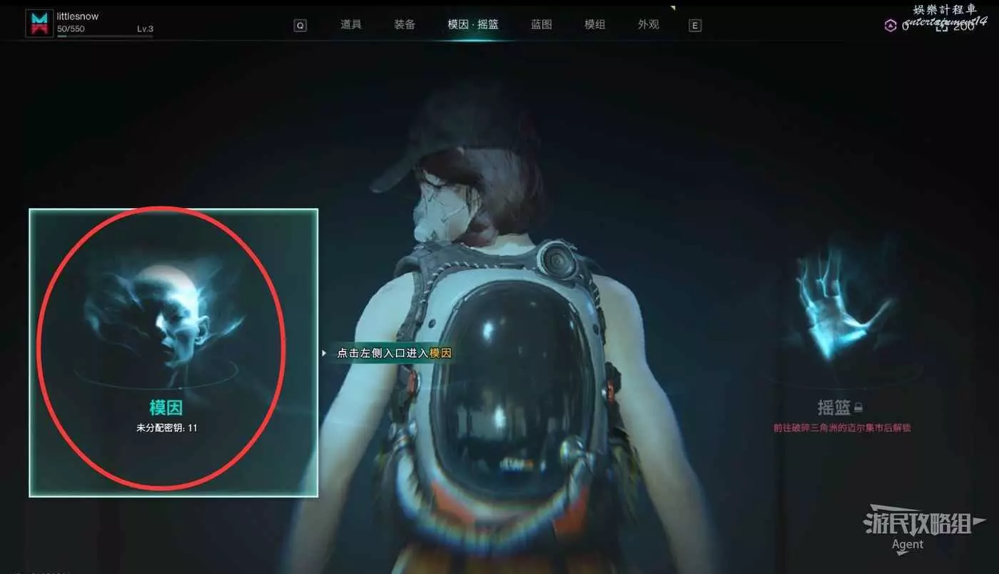 按TAB呼出功能輪盤,選擇搖籃,點擊左邊的模因(技能樹)。