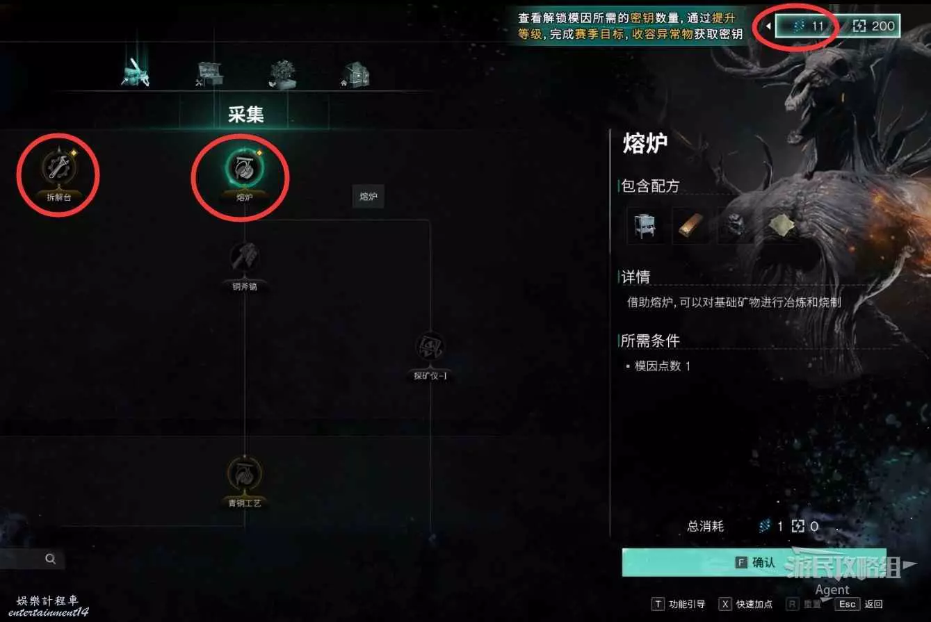 使用秘鑰點數學習技能樹上的技能。先學習拆解台、熔爐。
