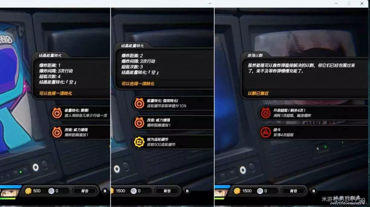 4.同時我們可以拾取到各種buff,建議先選擇【改造:威力增強】增加炸彈爆炸距離,這樣可以同時炸掉更多怪,如果被怪堵住了,還可以使用【超載】,初始有5次機會,可以免除戰鬥直接消滅怪,如果【超載】次數不夠了,則可以通過buff補充次數,或者進副本打一波怪出來後,即可補充4次【超載】