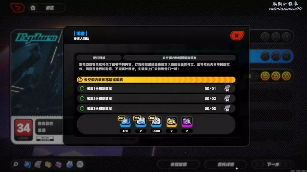 委託獎勵:繩網信用*450、邦布演算法模組*2、丁尼*90000、精英調查員物資箱*1、資深調查員物資箱*2