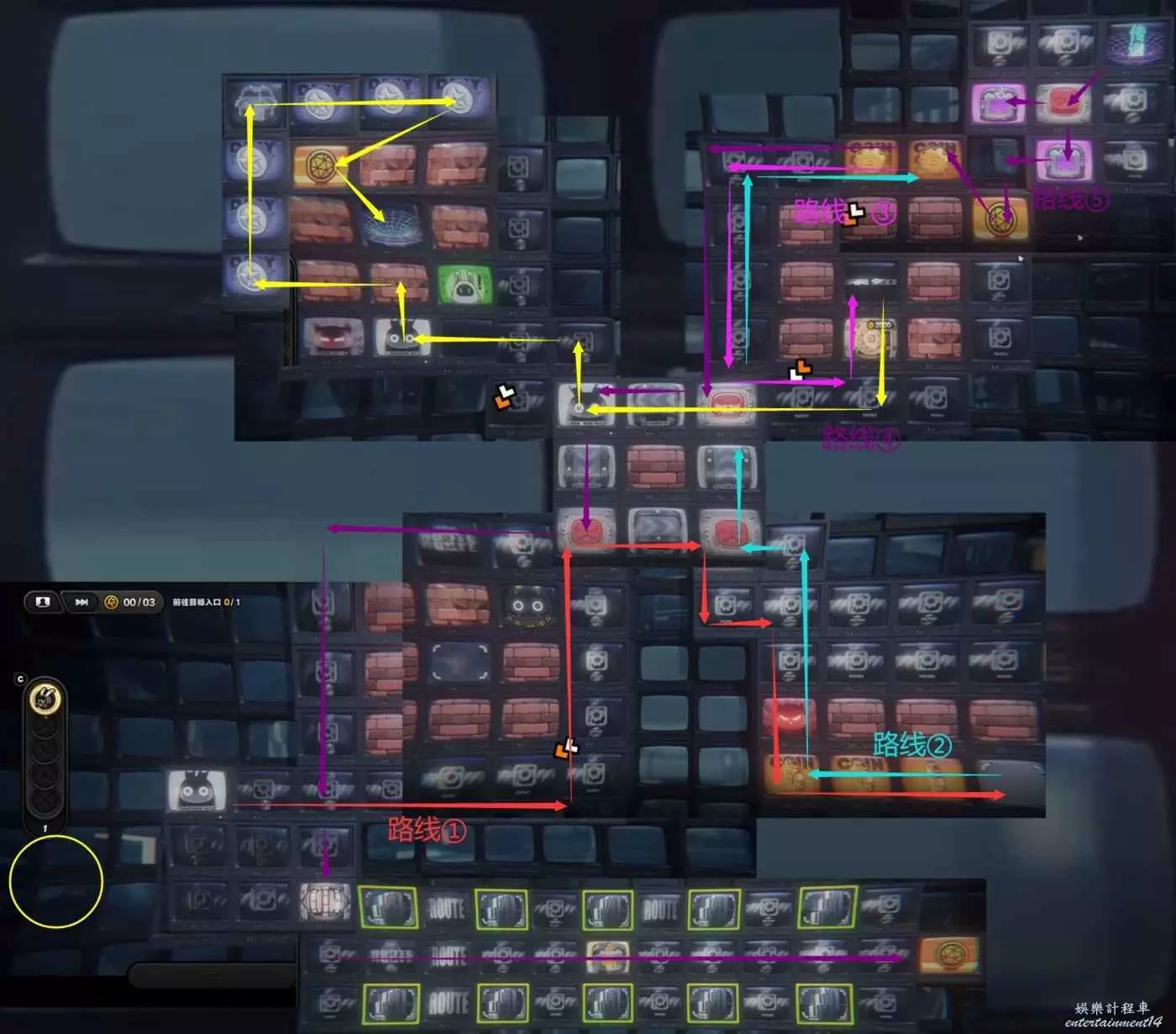 跟隨黃色路線放置炸彈擊敗以骸以及擊碎磚塊。