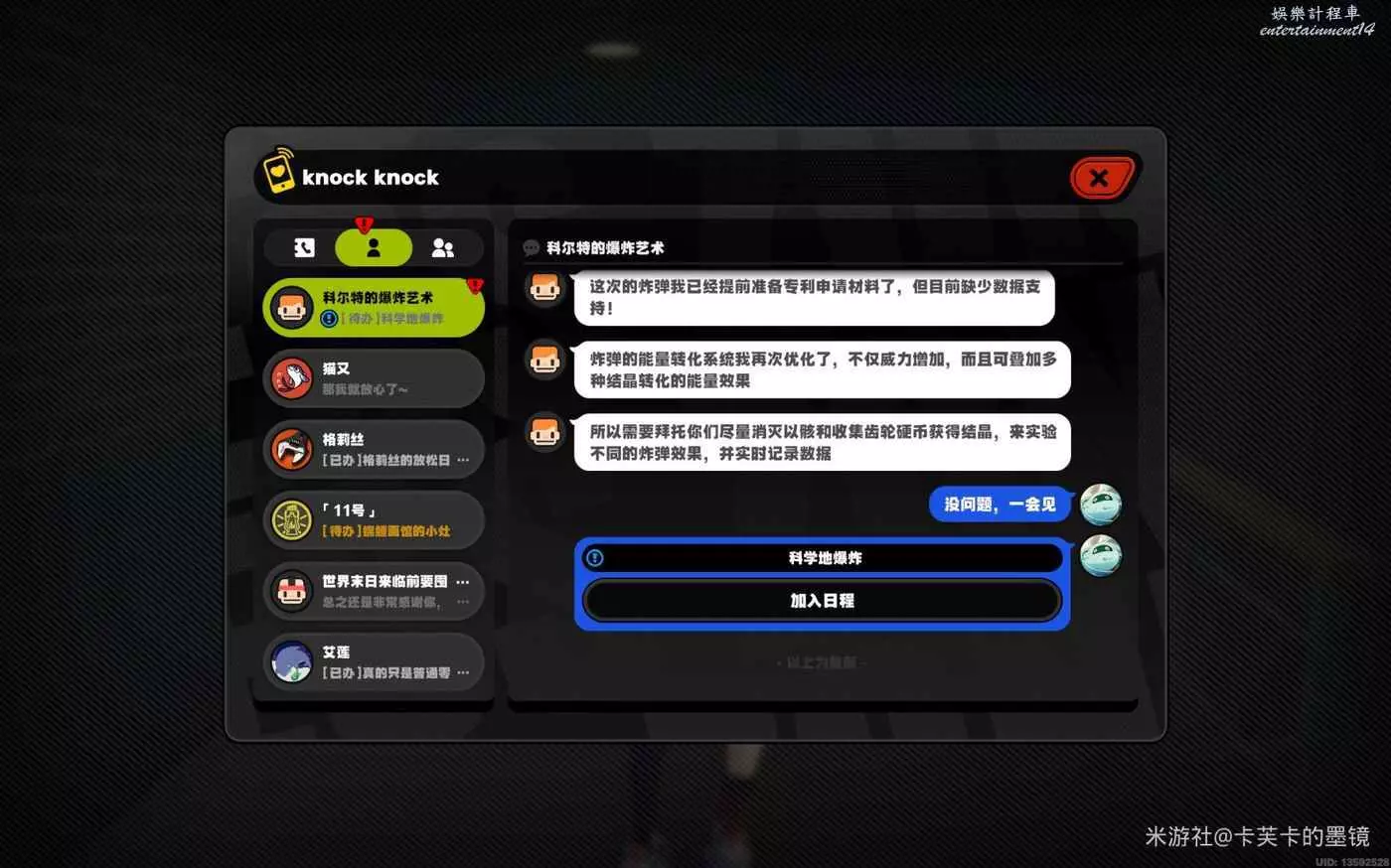 在完成前置委託並且等待一段時間後,可以接到科爾特的爆炸藝術的短信,對話後接取委託【科學地爆炸】