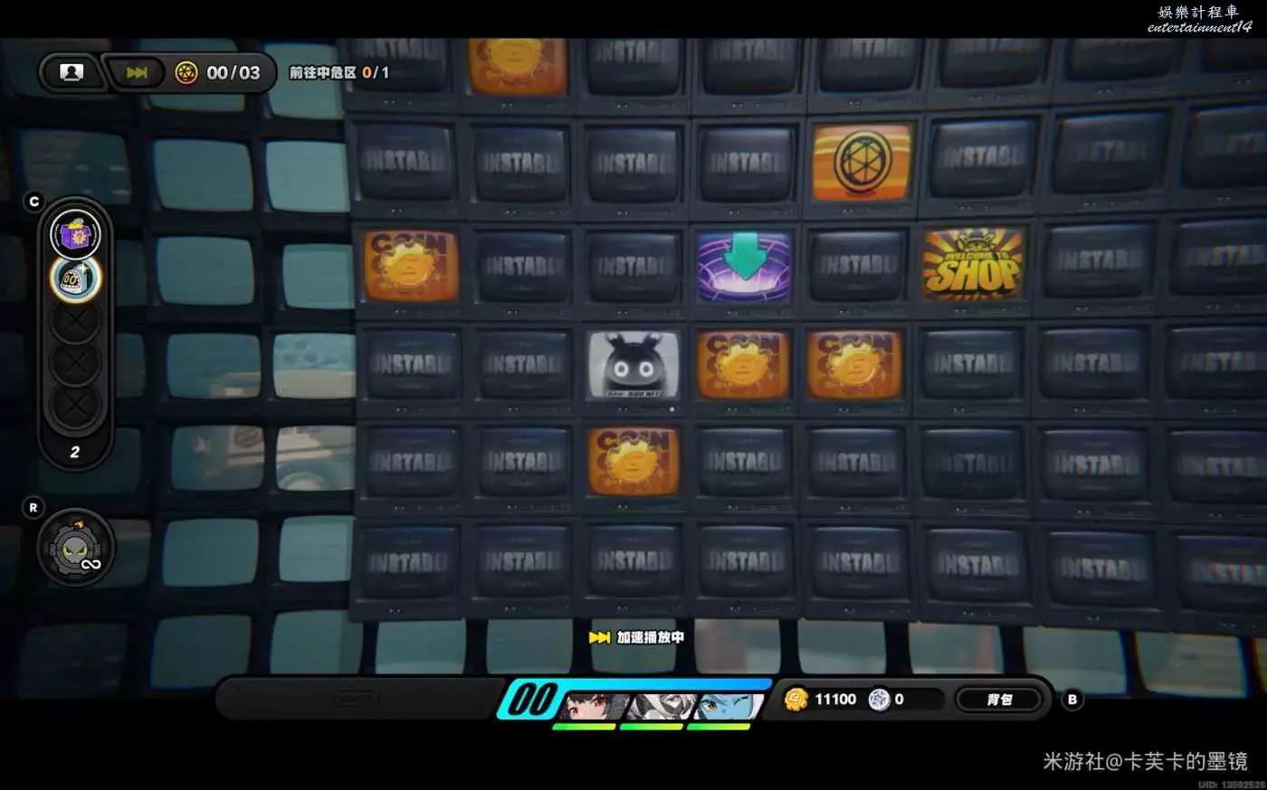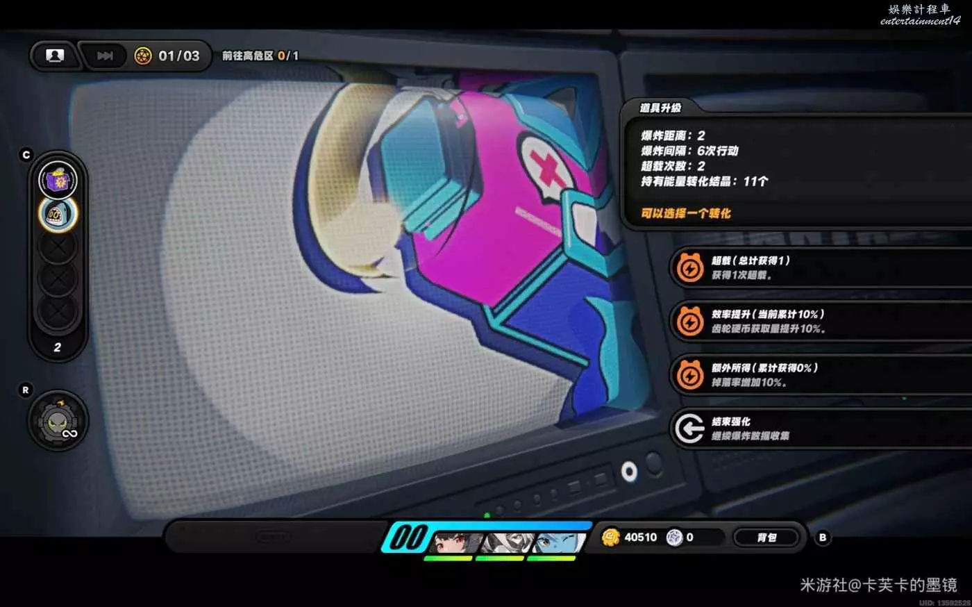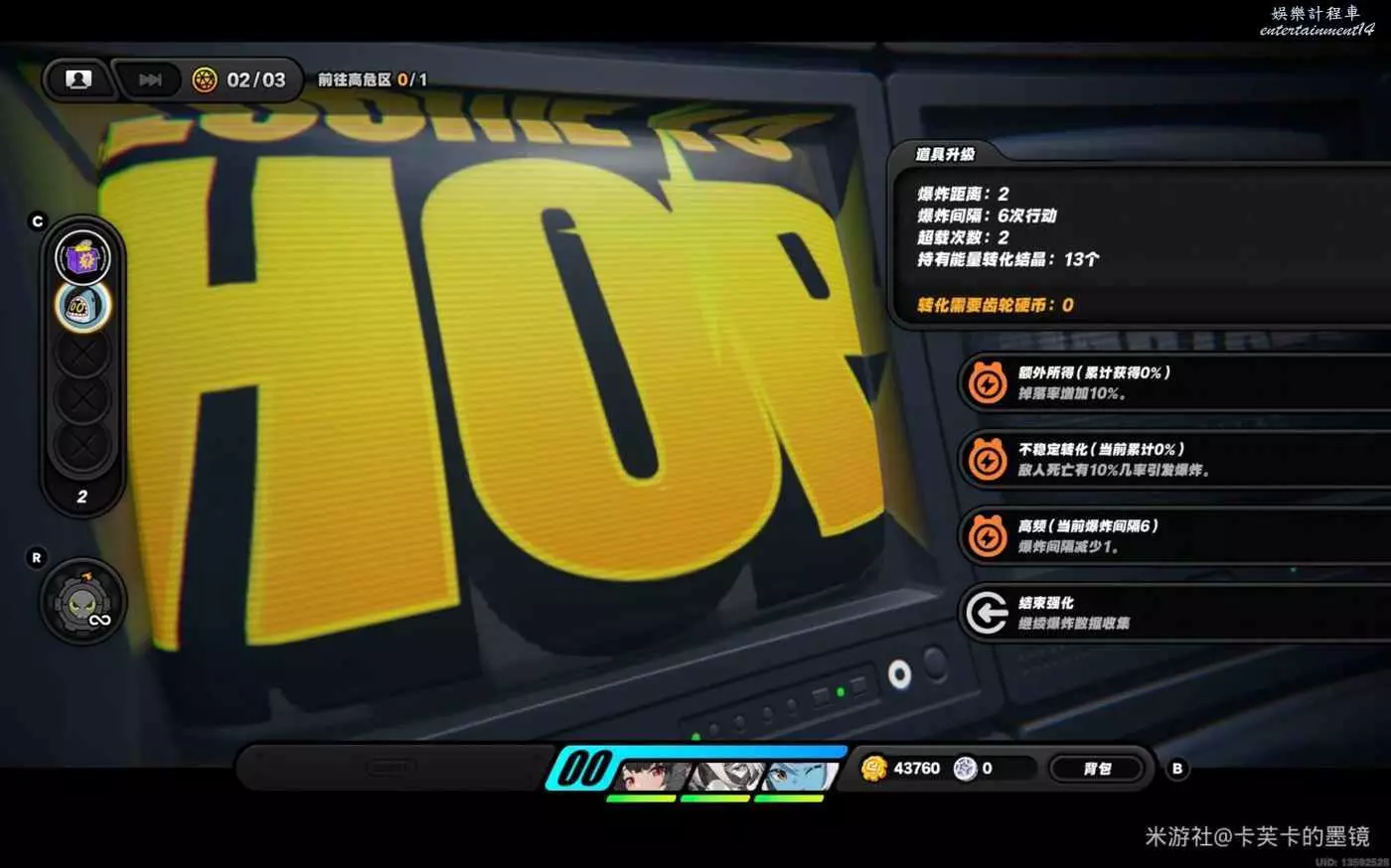依次強化【高頻】【賞金】【高頻】【賞金】【超載】【效率提升】【效率提升】,結束強化來到下一層