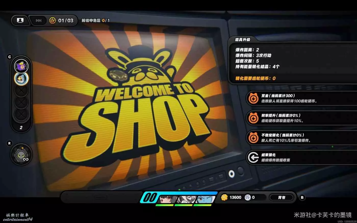拾取全部道具後,進入商店強化(消耗依次為0,750,2250,3750,5250,7250,9250,11250……)