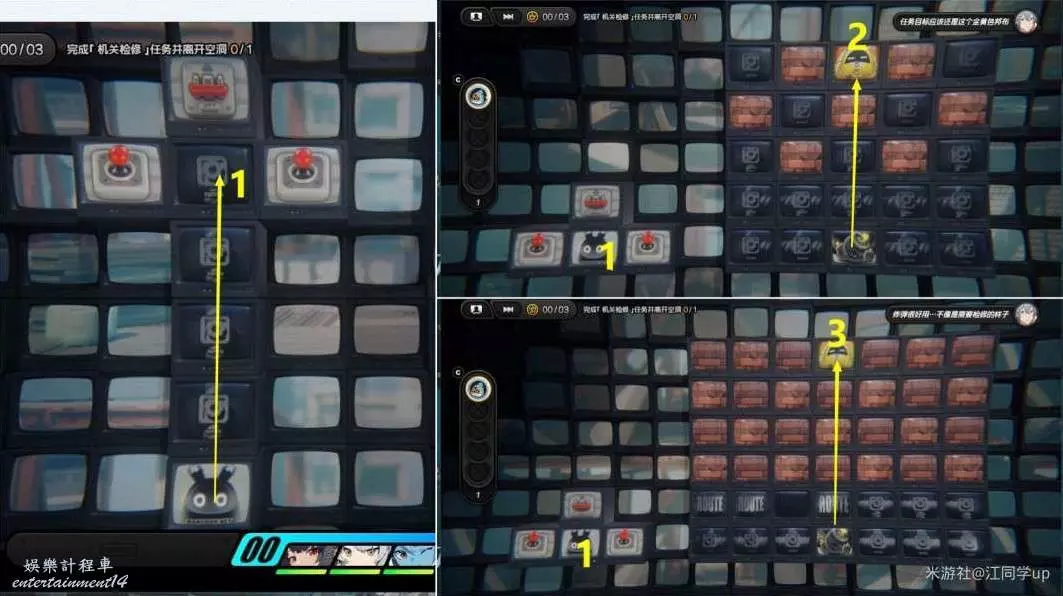 (1)進入後,去1區域,1區域可以控制右邊的炸彈行動,將炸彈,向上移動2次即可炸掉2區域的黃金邦布,接著繼續將炸彈,向上移動3次即可炸掉3區域的黃金邦布
