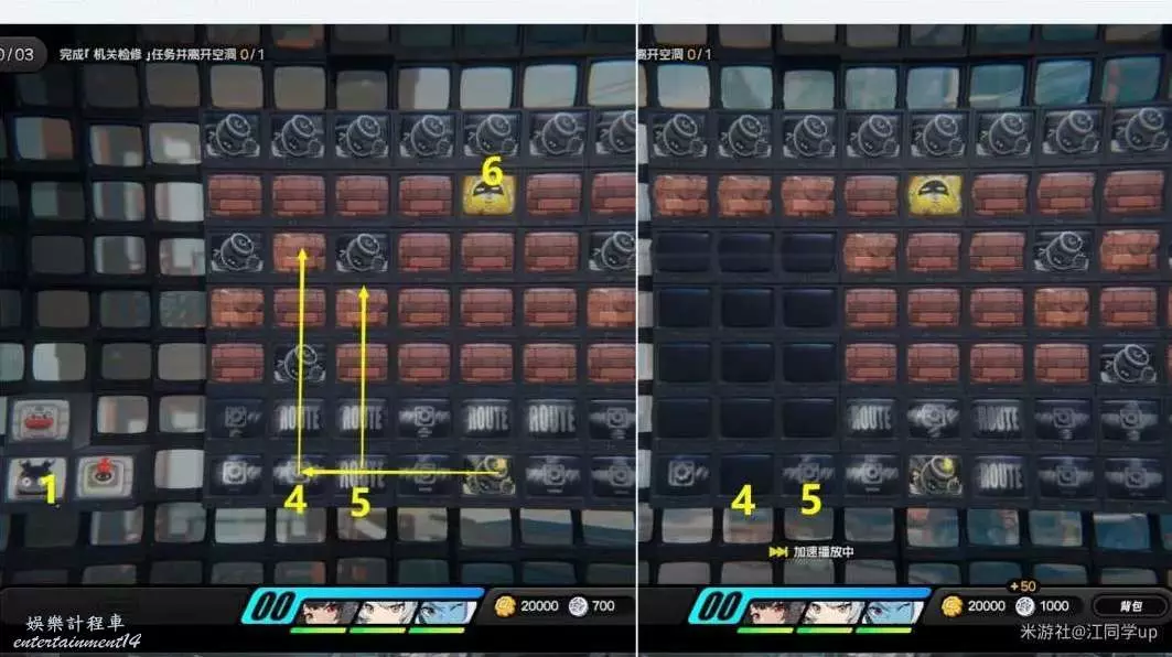 (2)接著先將炸彈移到4區域後再向上移動3次,然後再將炸彈移到5區域後再向上移動2次後,即可炸掉6區域的黃金邦布