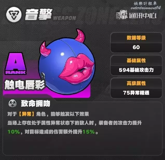 場上有異常狀態的敵人時獲得增傷和攻擊力。特效泛用且啟動簡單,當前版本的異常隊伍來說,把派派專武除去,其餘倆A級音擎在當前版本啟動還是較為困難的。考慮到異常音擎的強度來說,觸電唇彩還算可以的。不過這也只是針對格莉絲來說的,後續版本如果出其他異常角色不保證觸電唇彩還有優勢。