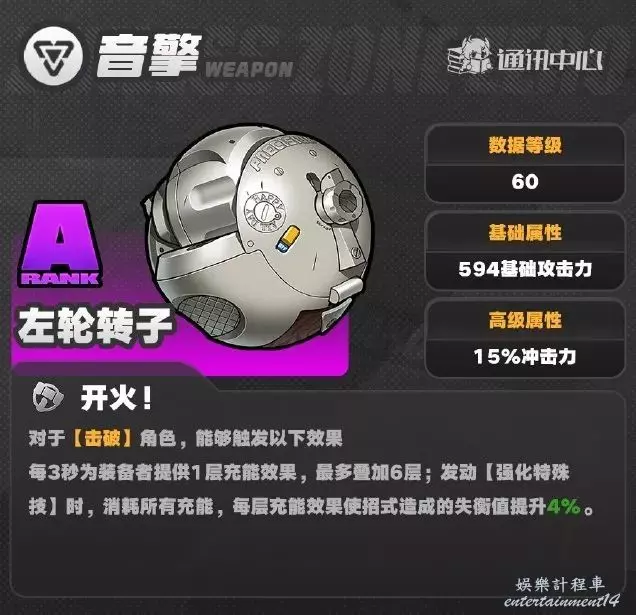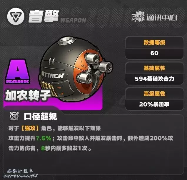 副詞條暴擊率,特效加攻和額外倍率,十分泛用的一個強攻用音擎。如果你有11號、艾蓮或者貓又而且主練,目前又抽不到專武。那麼加農轉子是一個非常不錯的選擇,尤其是對沒有專武的艾蓮來說。