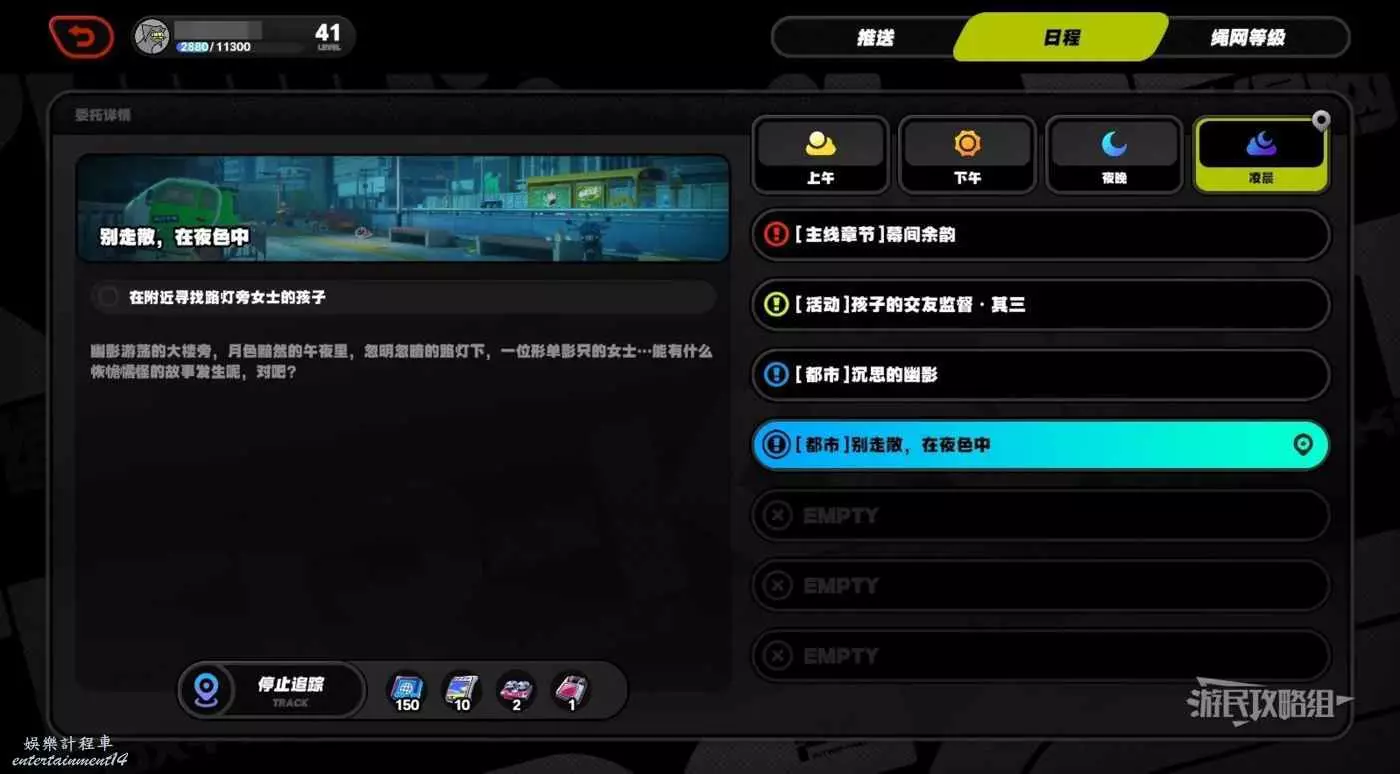 絕區零 (Zenless Zone Zero) 別走散在夜色中孩子位置攻略 16 7 月 2024-07-16 廣告 作者:瑞破受氣包 來源:遊民星空 別走散在夜色中孩子位置 此委託觸發時間為淩晨,觸發位置在【芭萊大廈前】。 傳送到【芭萊大廈前-廣場步道】,沿著樓梯來到下層下沉廣場,不要出門,在通道右側的安全出口處可以看到一個小孩,與【陰影處的孩童】對話。 然後從孩子旁邊的門出去,前往下沉廣場,就在雕像右側的樓梯下方可以看到一隻黑色的邦布,與邦布對話。 跟隨任務指引,前往雕像旁邊拾取鬧鐘。拾取後自動觸發劇情,委託完成。