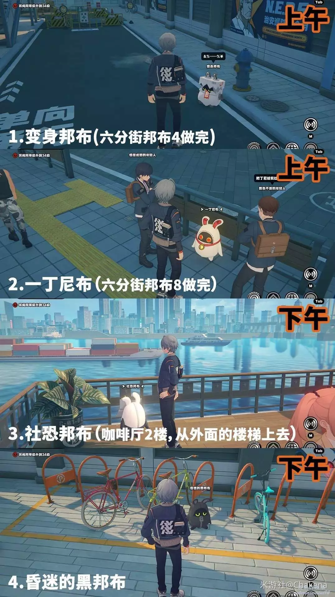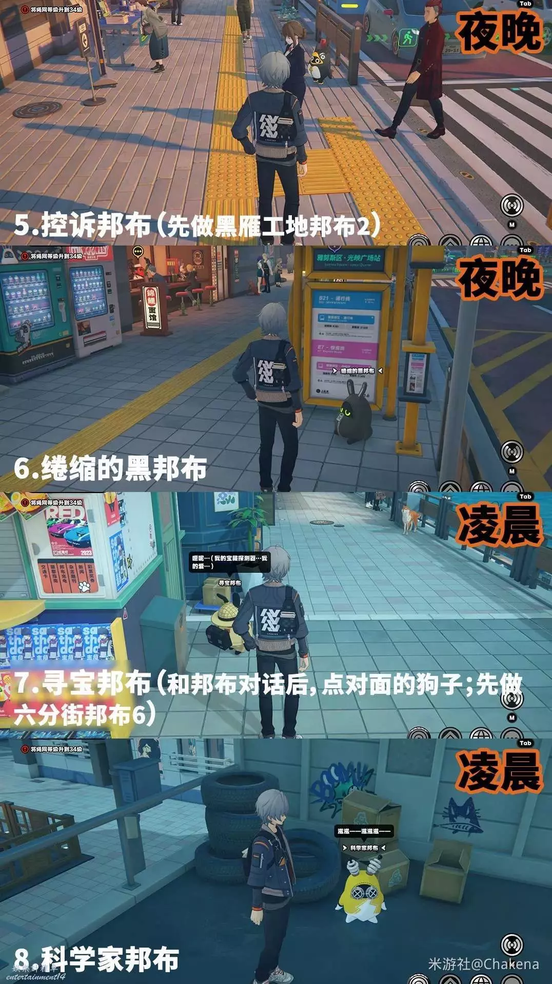 絕區零 (Zenless Zone Zero) 光映廣場邦布收集攻略 16 7 月 2024-07-16 廣告 作者:Chakena 來源:米遊社論壇 觀前提示 本攻略適用於35級之前,未做完主線任務第三章的繩匠,也就是說收集的是喵吉事件簿光映廣場篇第1頁的獎章。 在收集邦布前,建議先收集完成「六分街」和「黑雁工地」的邦布;修復類邦布可以先接通靠近重點的節點,最後接通靠近起點的節點,可以有效節省時間。 收集邦布的兩個小技巧:①喵吉事件簿的「雪中送炭」和「急公好義」兩組徽章會給予提示資訊②點擊左上角的時間段可以查看本區域內本時段有沒有需要幫助的邦布。