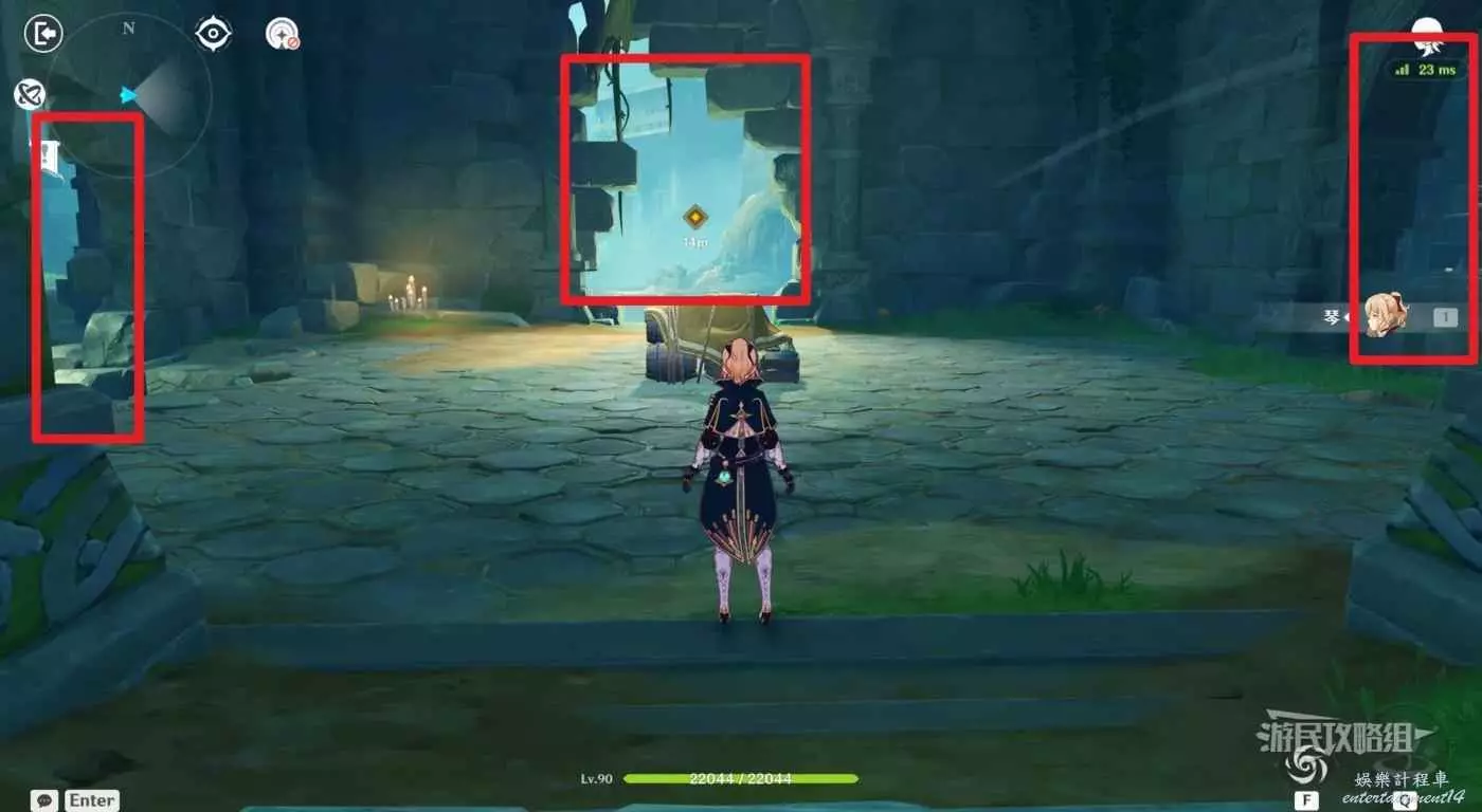 進入挑戰後,區域正中間是需要守護的箱子,敵人會在箱子四周刷新,參考下圖,其中三面都是可以進行地形殺的,只有我們所在的入口位置是無法地形殺的,但距離左側的斷崖比較近,可以將此處的敵人推到左側利用地形將其擊殺。