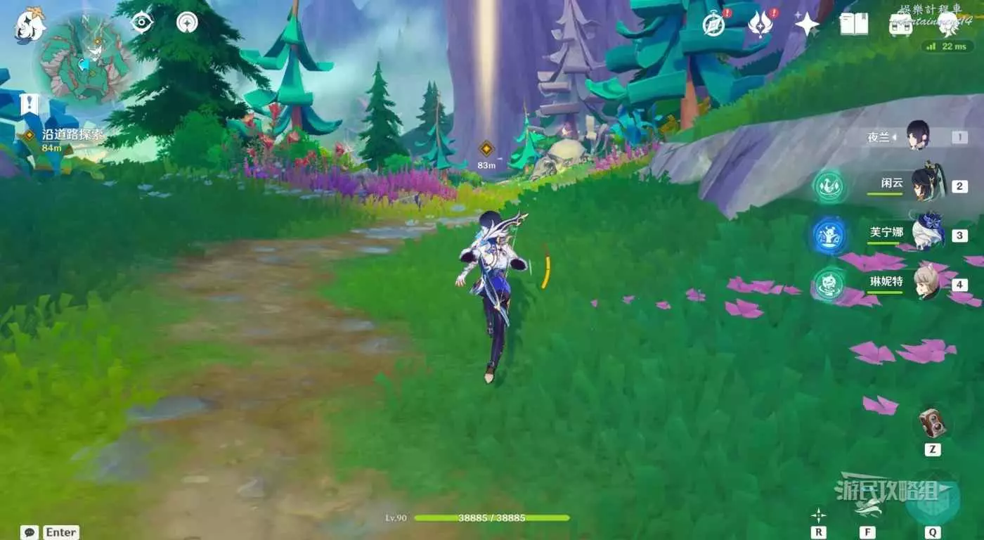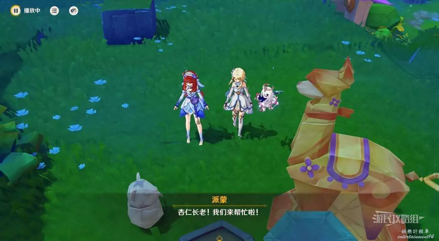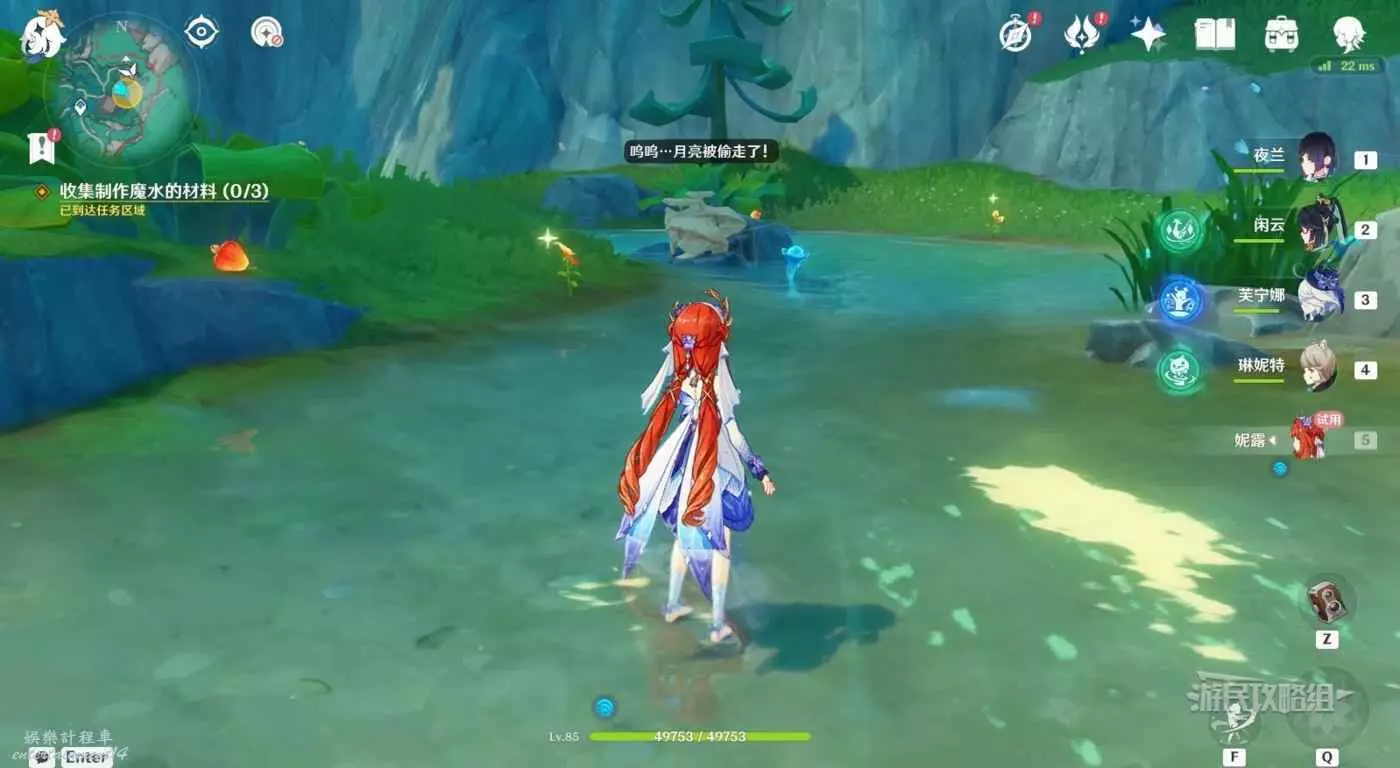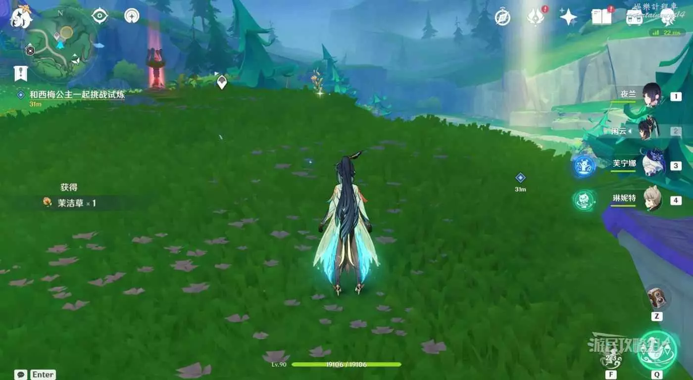 對話結束後,跳到下方拾取水邊的金魚草、日落果、月蓮,拾取完成後,返回賜福小屋即可。月蓮前有蕈獸,可以不打撿完直接走。