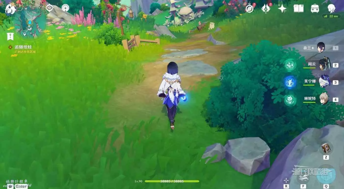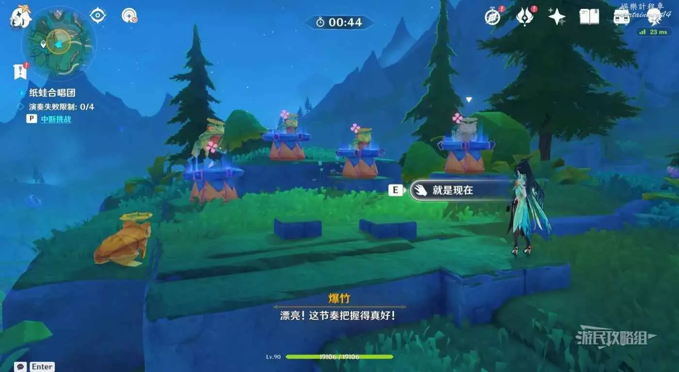 到達目標位置後自動觸發對話,對話後需要打拍子,準備好後與石台下方的橙色紙蛙互動即可開始音遊。按照節拍按下提示的按鍵即可。