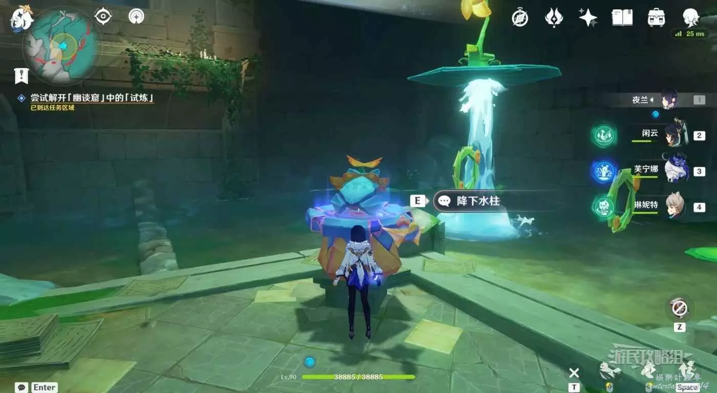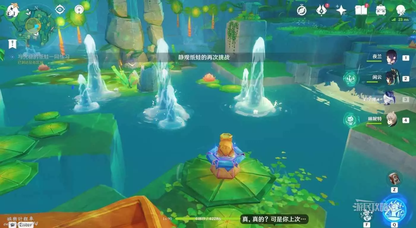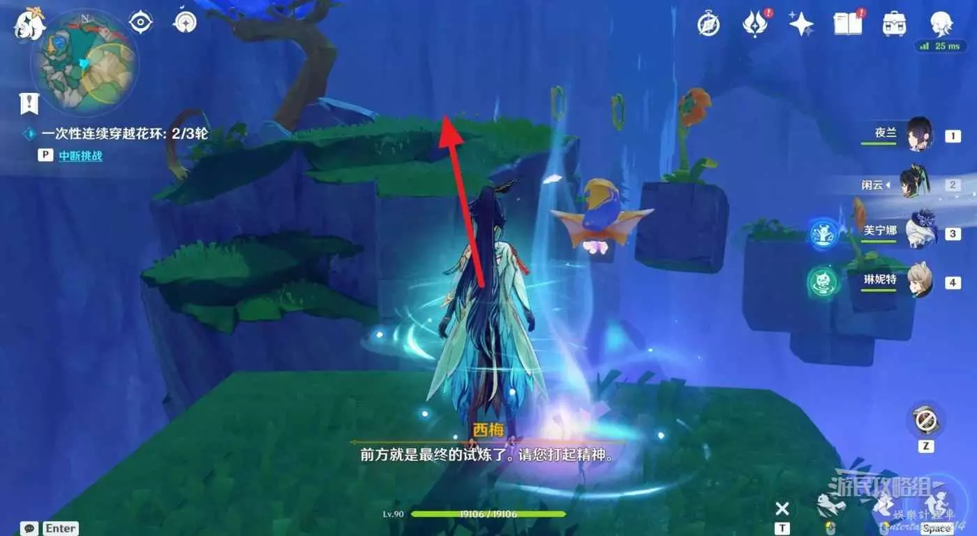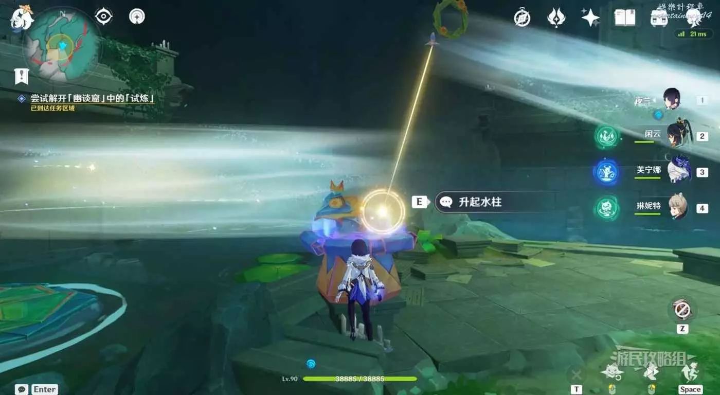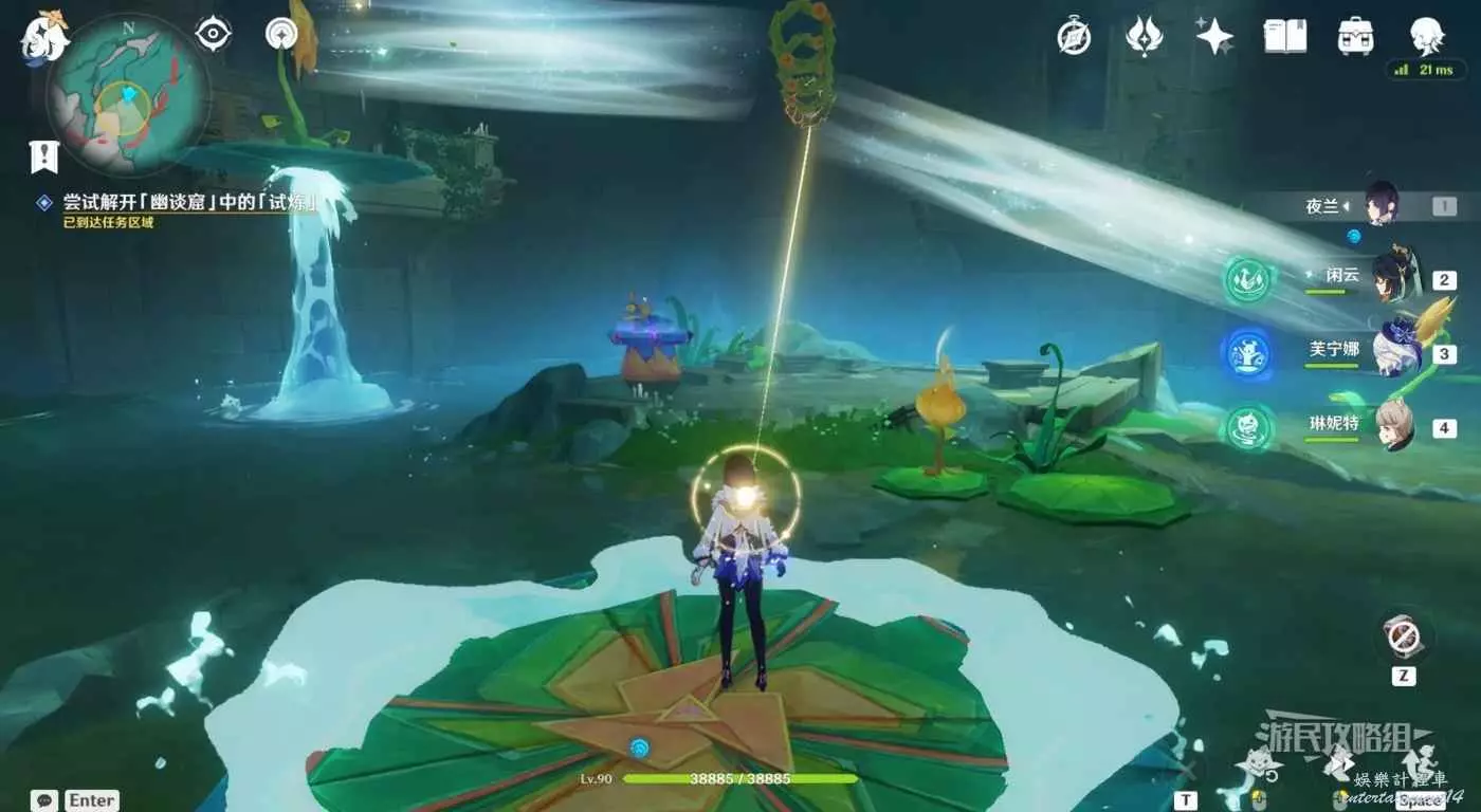 回到區域初始位置,左側近處的荷葉會隨著水柱升高而被抬起,等水柱下降時站在荷葉上,等待水柱升起,金色光線會自動穿過最高處的一組花環,點擊攻擊鍵,完成試煉,觸發對話。