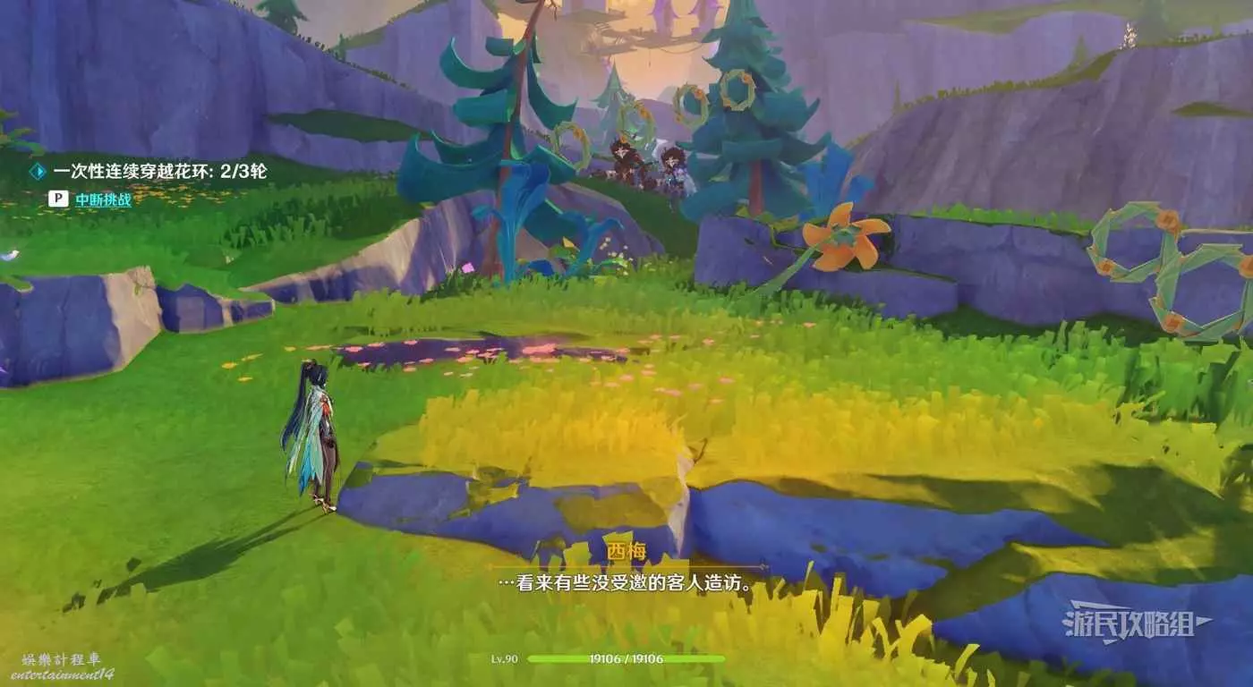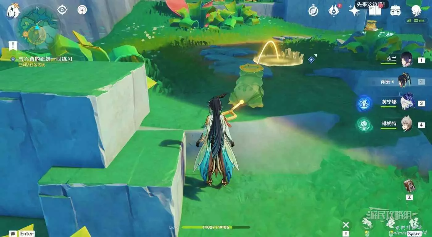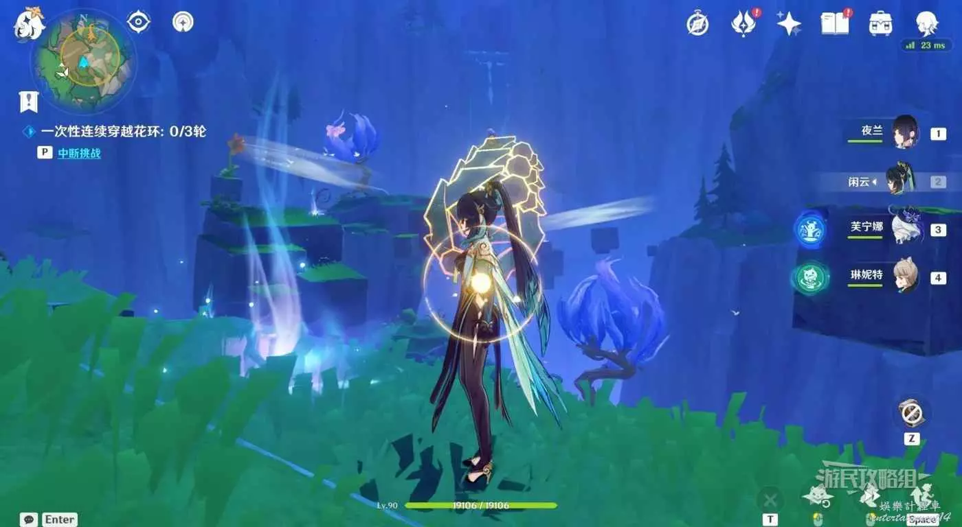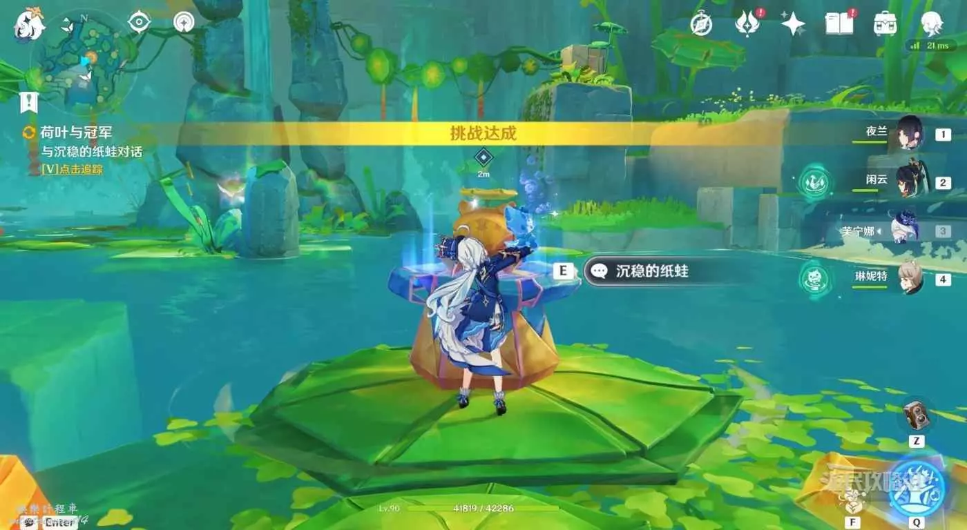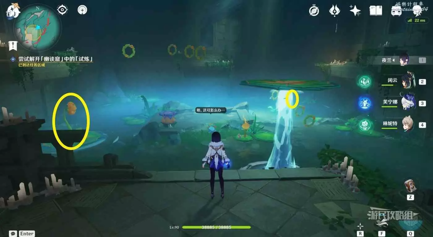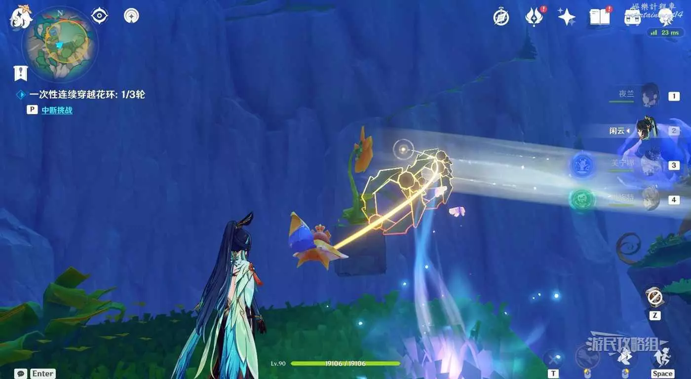 回到區域初始位置,左側近處的荷葉會隨著水柱升高而被抬起,等水柱下降時站在荷葉上,等待水柱升起,金色光線會自動穿過最高處的一組花環,點擊攻擊鍵,完成試煉,觸發對話。
