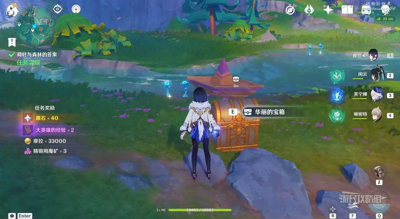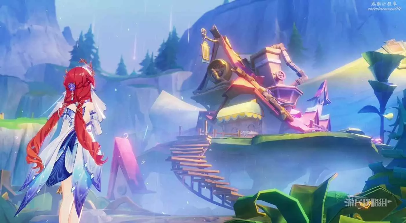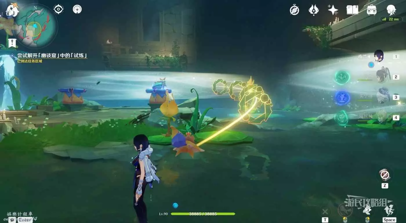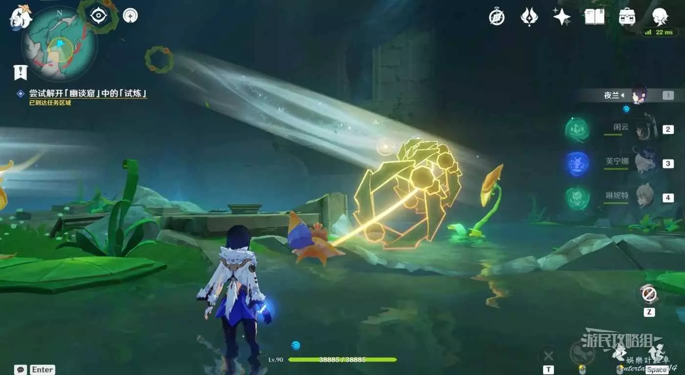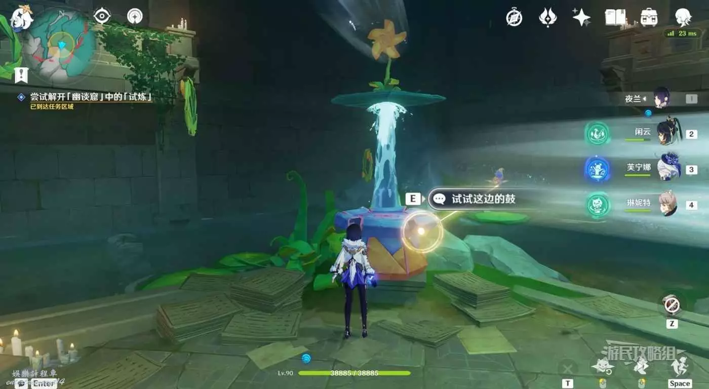 回到區域初始位置,左側近處的荷葉會隨著水柱升高而被抬起,等水柱下降時站在荷葉上,等待水柱升起,金色光線會自動穿過最高處的一組花環,點擊攻擊鍵,完成試煉,觸發對話。