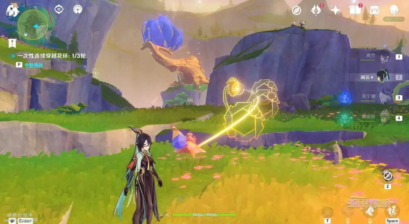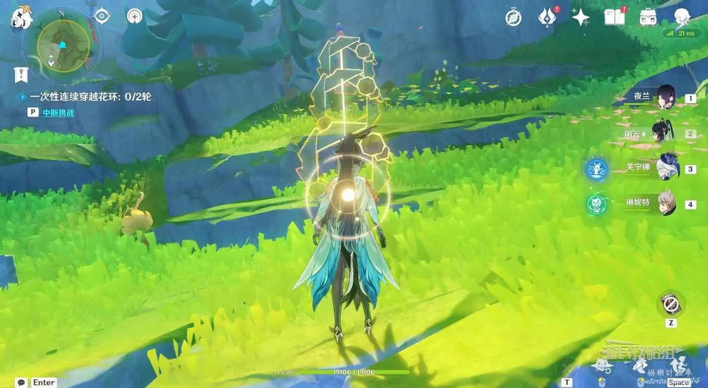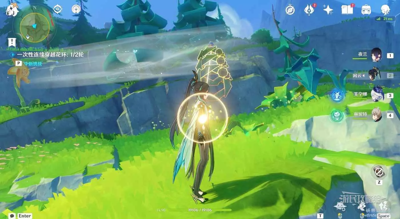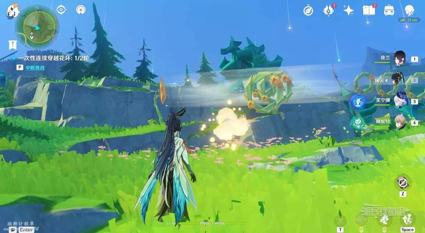 靠近目標位置後自動觸發對話。對話結束後按T與公主一起參與試煉。這裡與之前的試煉一樣,需要一次性穿過一組花環。第一組花環,需要讓金色光線同時點亮最後的花朵,啟動風場。