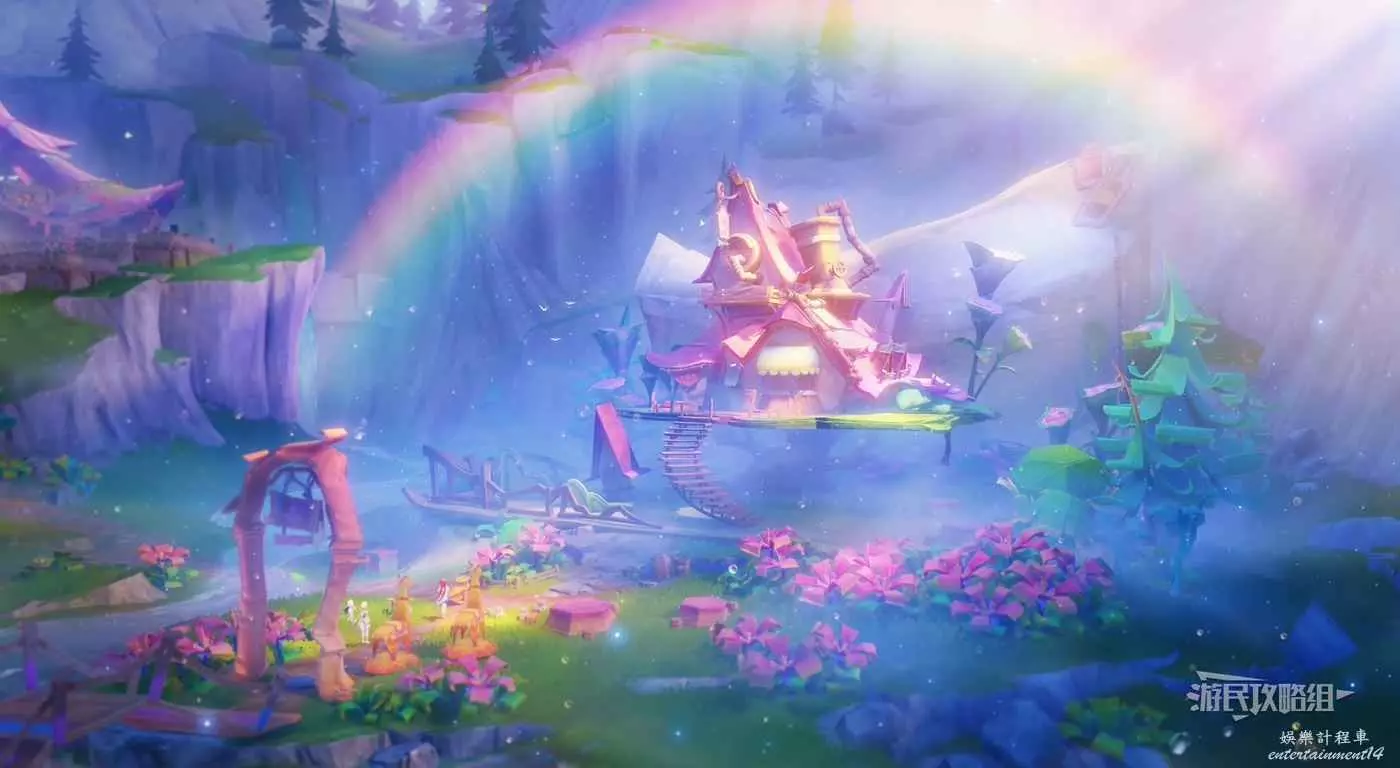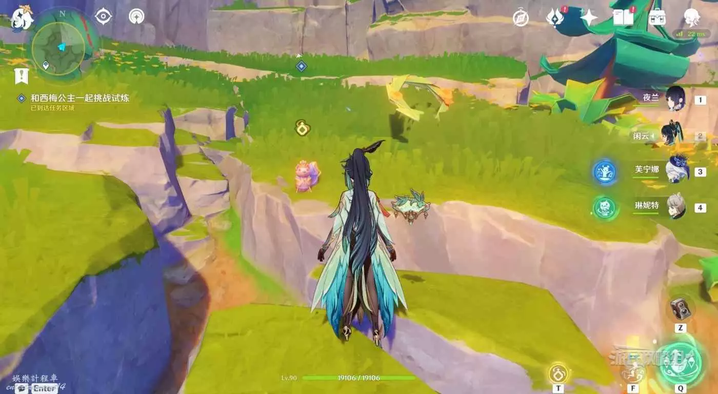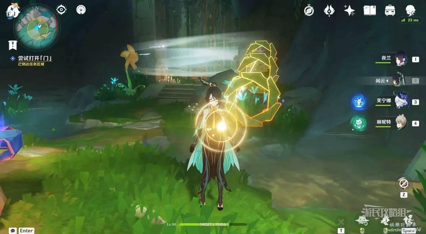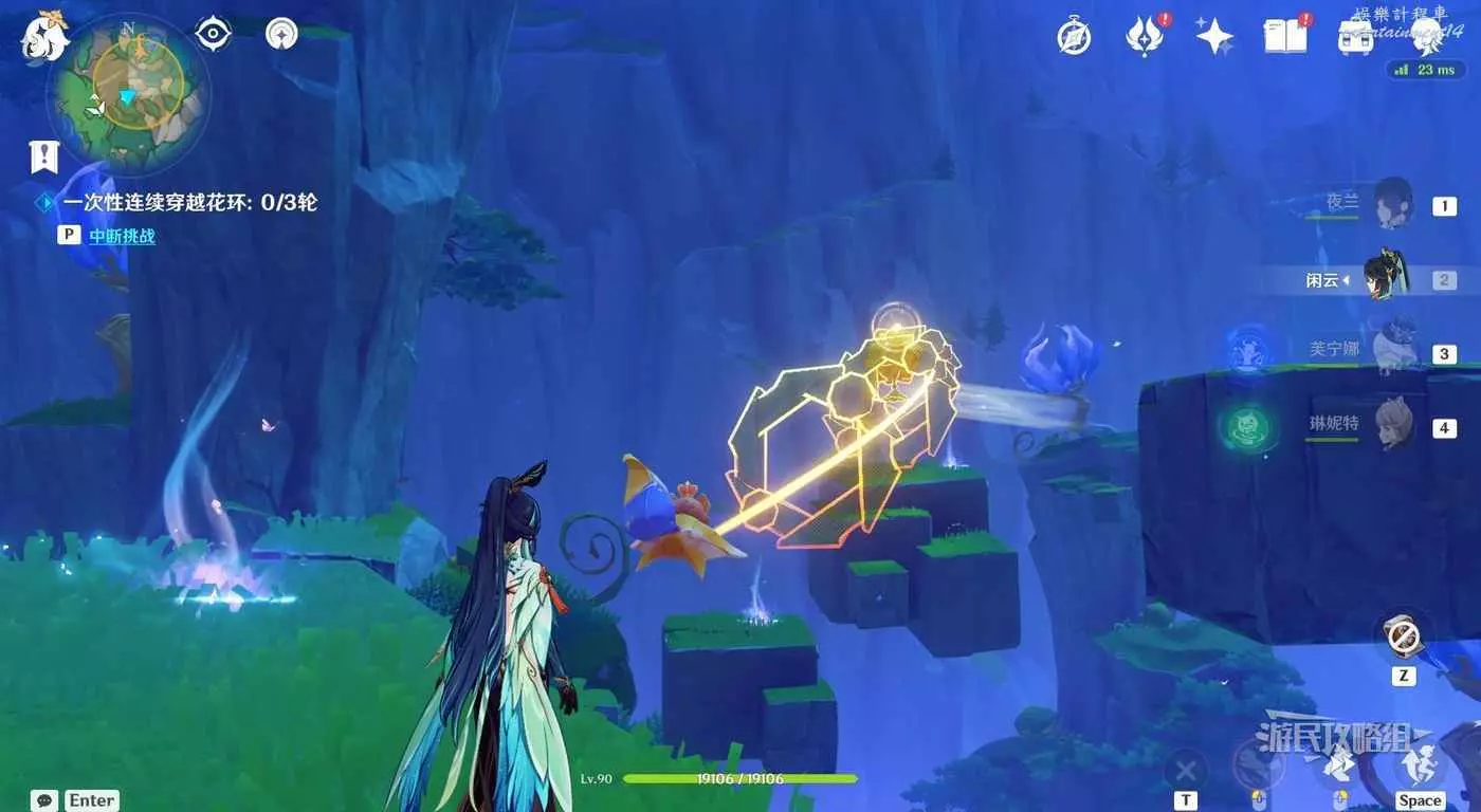 靠近目標位置後自動觸發對話。對話結束後按T與公主一起參與試煉。這裡與之前的試煉一樣,需要一次性穿過一組花環。第一組花環,需要讓金色光線同時點亮最後的花朵,啟動風場。