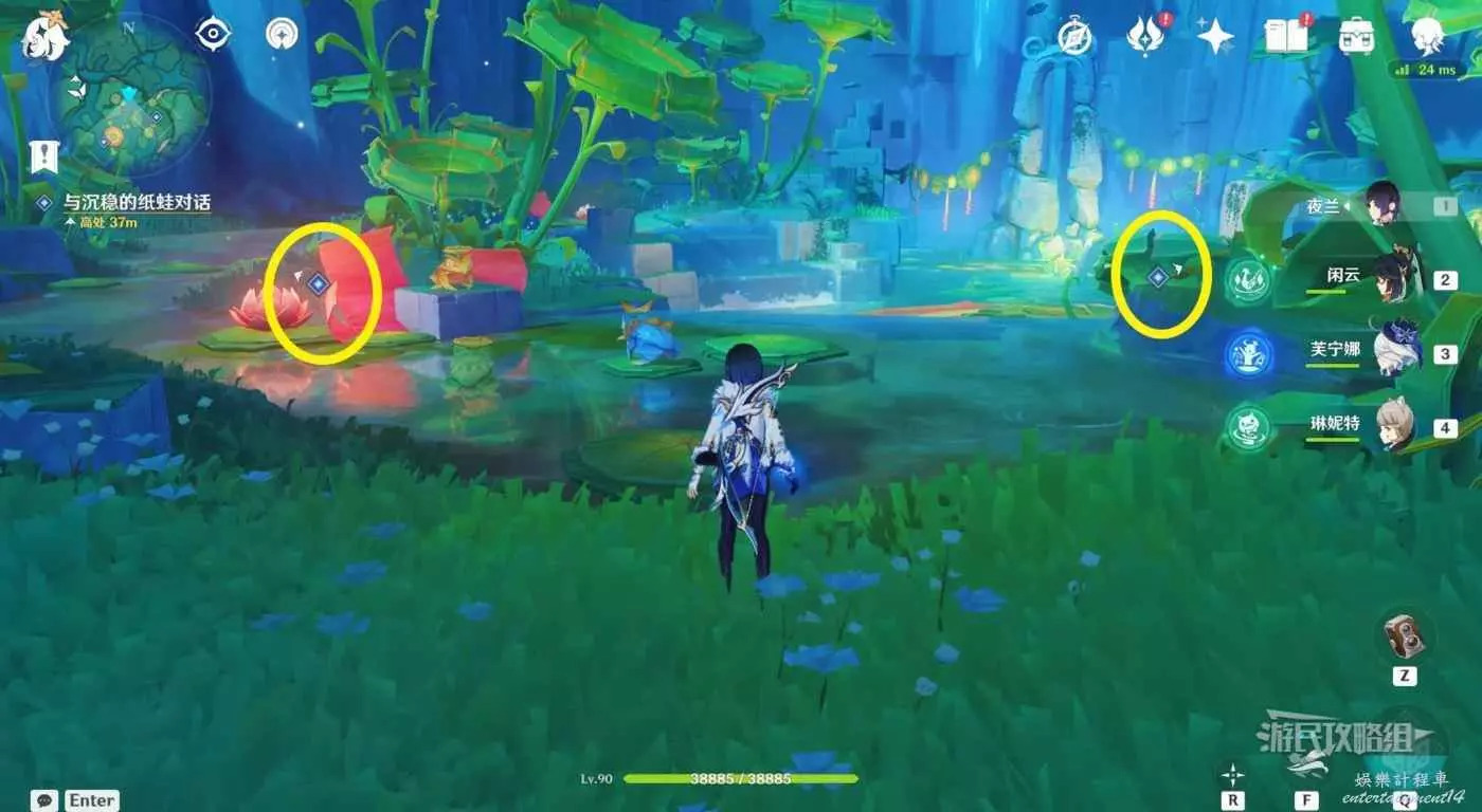來到紙蛙後方荷葉上,等待水柱升起時,點按攻擊鍵,讓金色光線穿過高處的一組花環。