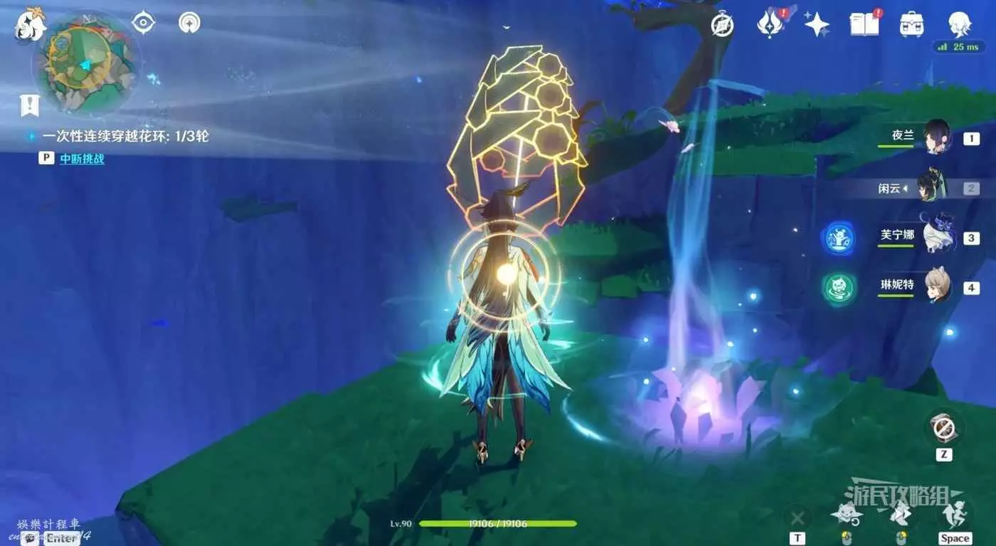 完成後利用旁邊的紫色光點到達最遠處的平台,旁邊有傳送錨點。調整自己的位置讓金色光線穿過所有花環,即可完成試煉。