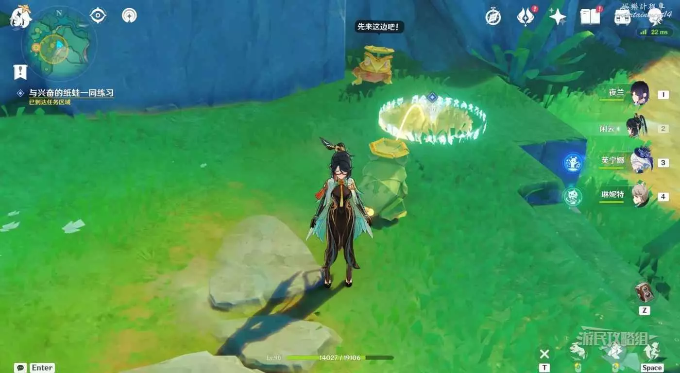 對話結束後,按T與紙蛙互動,操控紙蛙跳躍。角色與紙蛙的距離越近,跳躍距離越近。移動角色位置即可幫助紙蛙調整跳躍角度。先從陸地上跳到終點,這裡不用擔心落水。