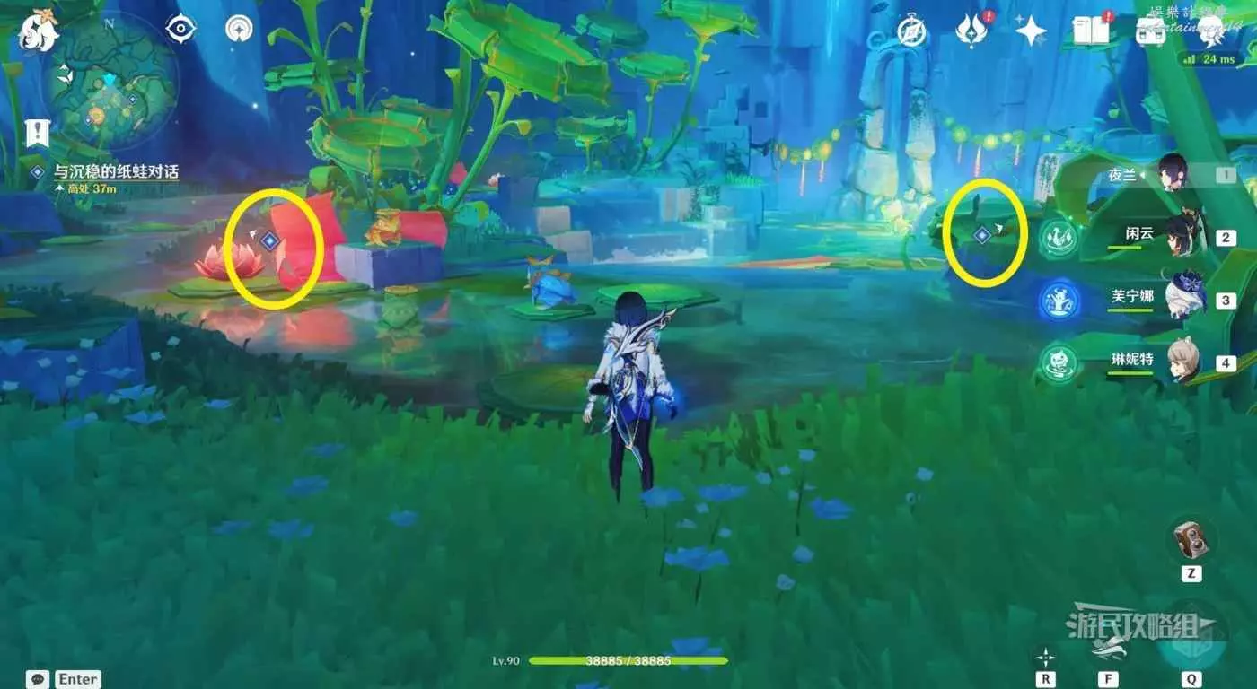 先來到右側沉穩的紙蛙,對話後,需要協助沉穩的紙蛙在適當的時機降下3個水柱,讓荷葉順利通過,不要太早也不要太晚,提前半個到一個身位的距離點擊降下水柱即可。