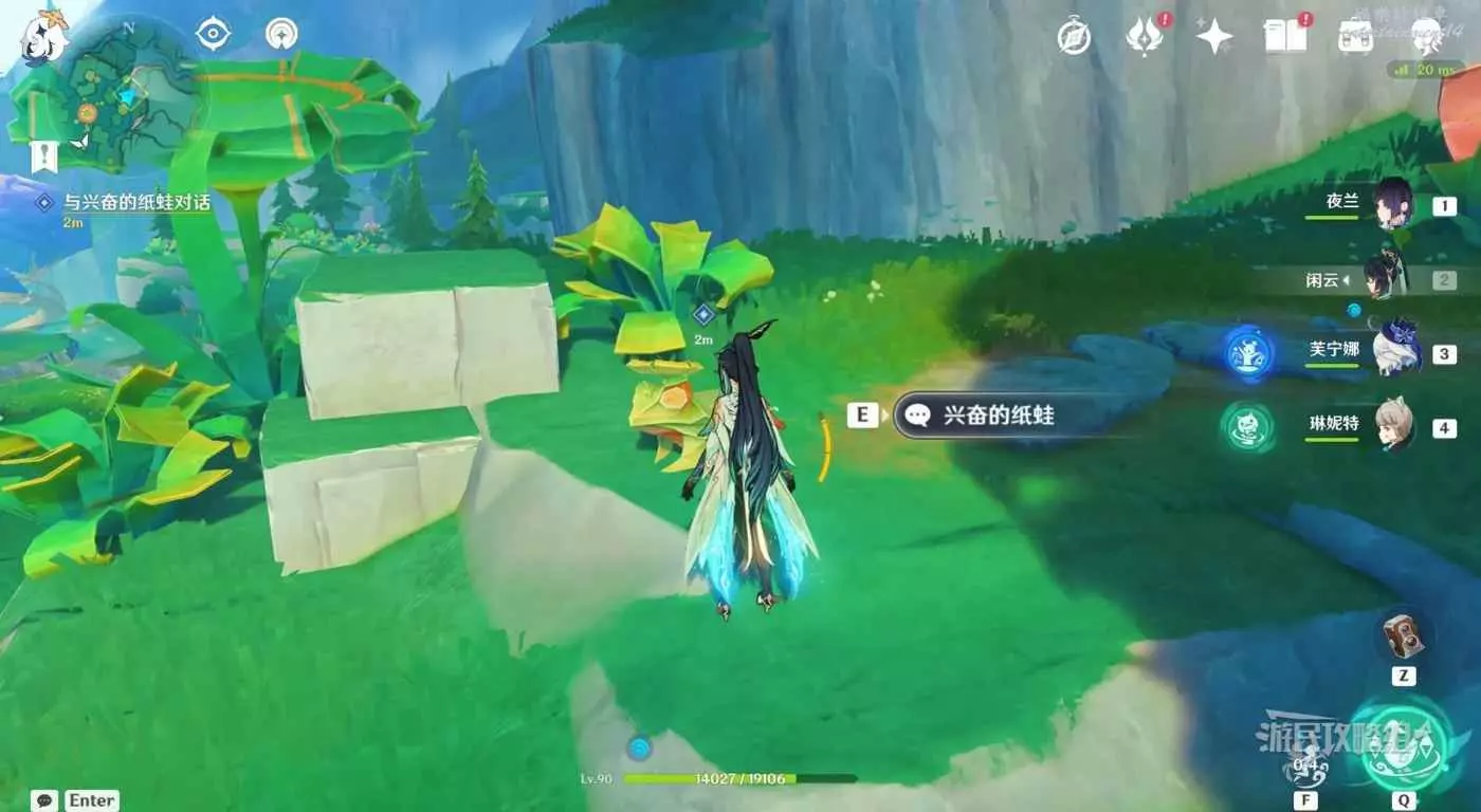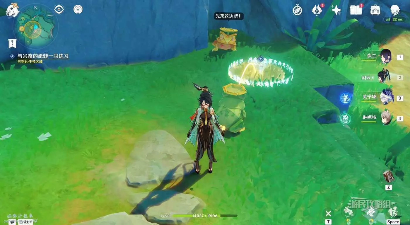 對話結束後,按T與紙蛙互動,操控紙蛙跳躍。角色與紙蛙的距離越近,跳躍距離越近。移動角色位置即可幫助紙蛙調整跳躍角度。先從陸地上跳到終點,這裡不用擔心落水。