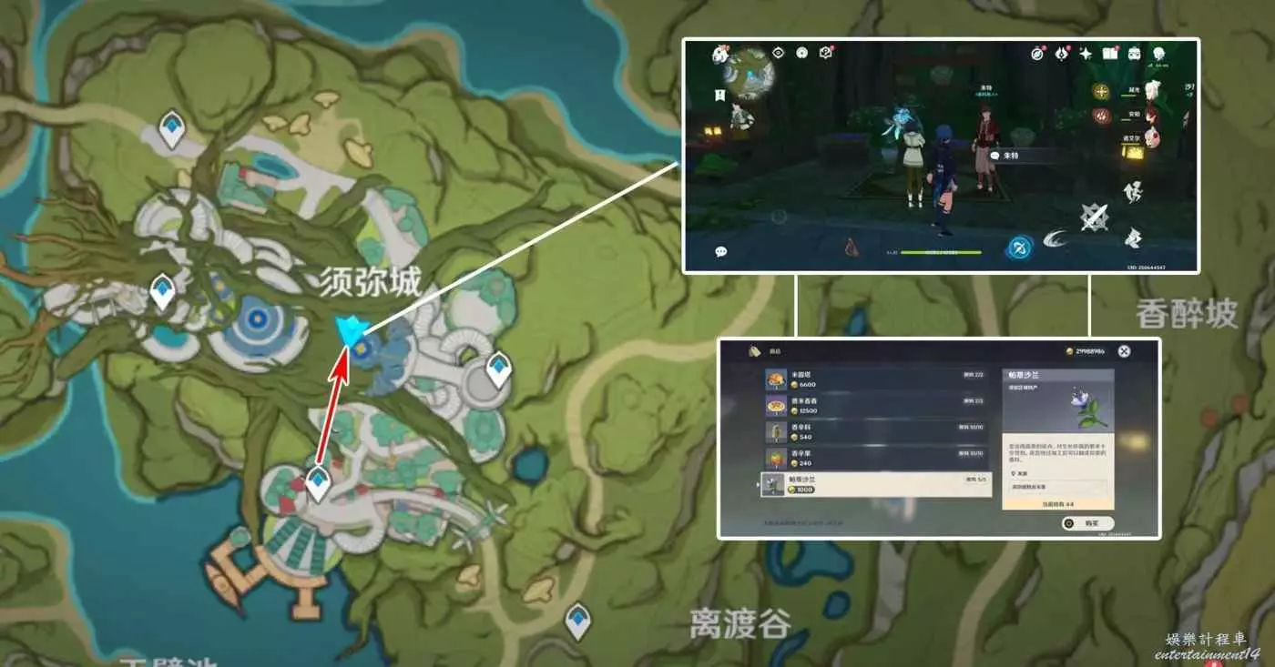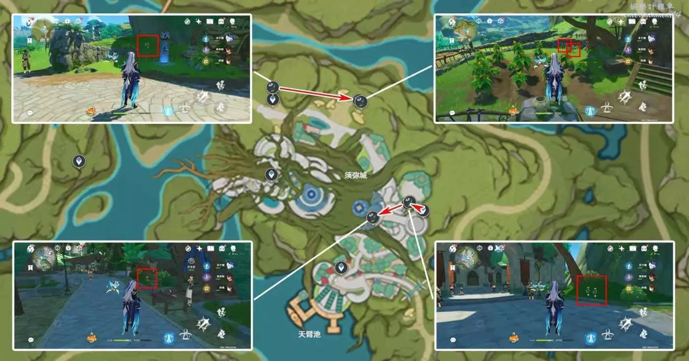 須彌城四個採集點如上,位置都比較好找。右下位置位於三十人團駐地大門右側,可以通過傳送點直接飛下來