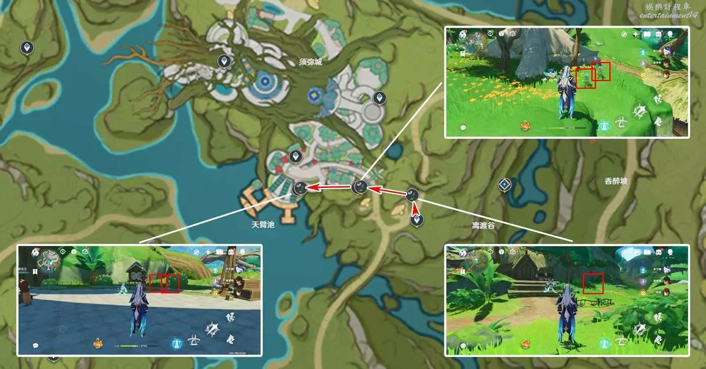 從須彌城東南傳送點出發,沿著下圖路線前進即可。注意右上點位位於須彌城大門南側柱子旁邊。