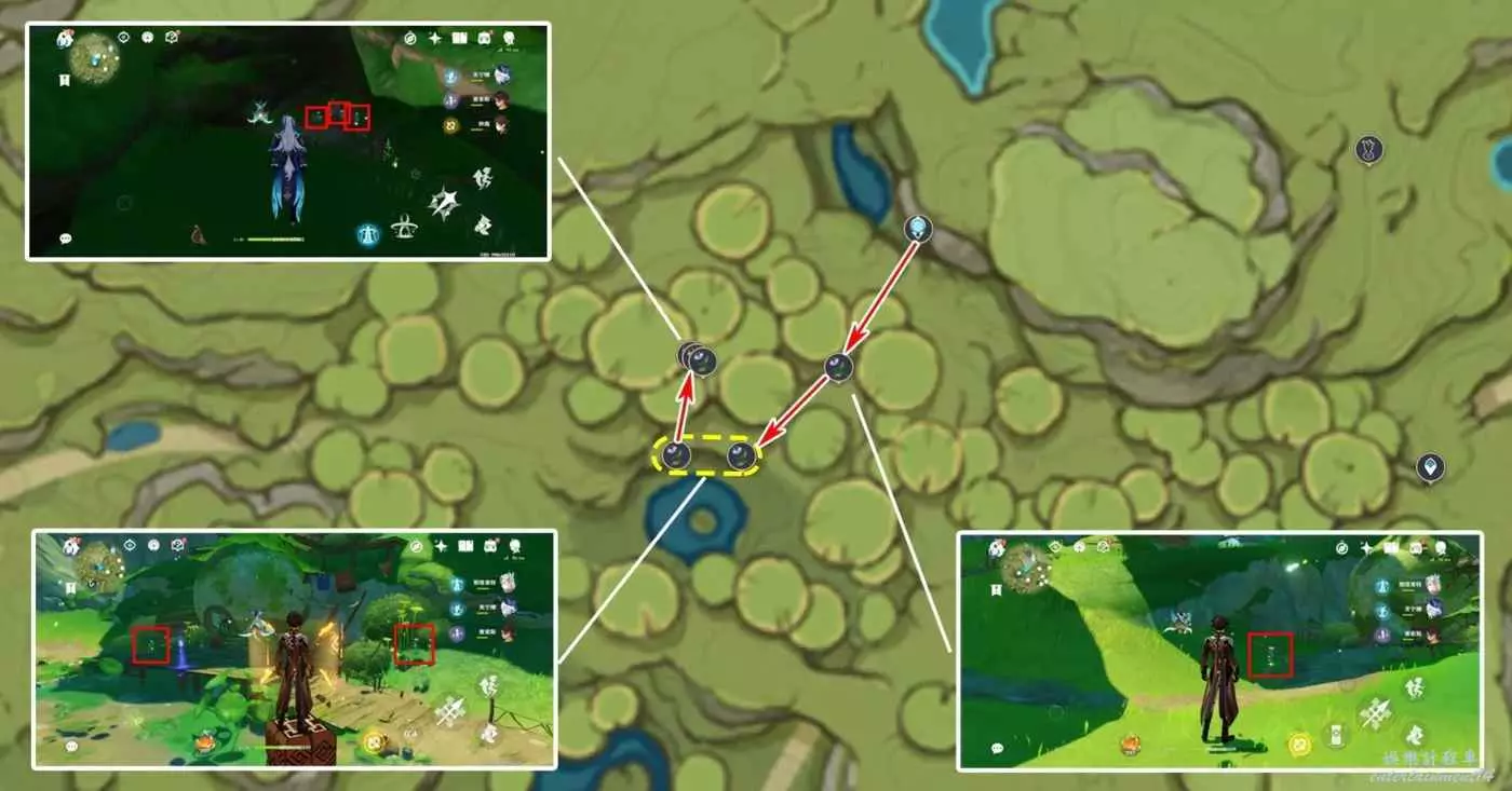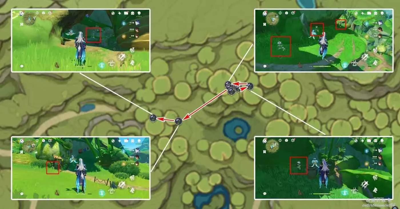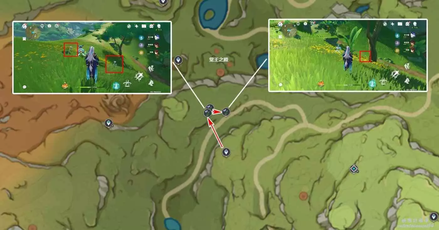 前兩個採集點都在小屋附近(附近有丘丘人);注意右下採集點位於山頂,左下採集點通過正上方的洞口直接進入。左中、左上採集點沿著山洞以及小路前進即可。
