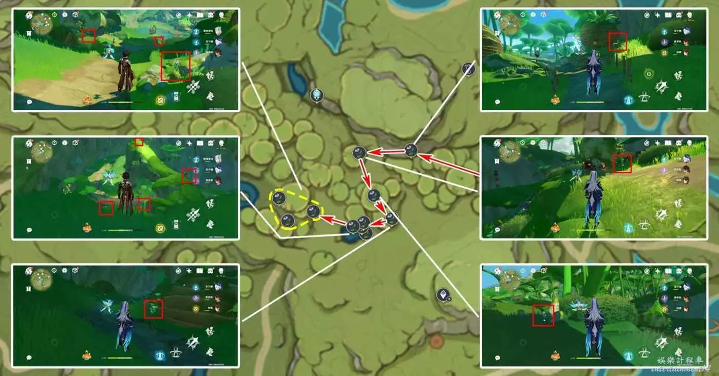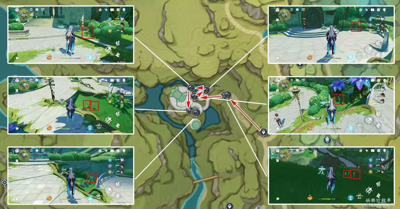 所有採集點均在禪那園內部,跟隨下圖路線採集即可。注意一下右下採集點位於禪那園西側入口位置。