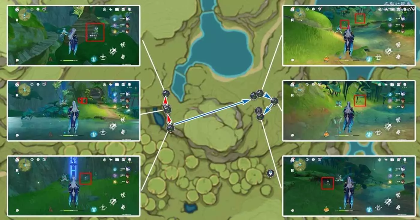 從桓那蘭那七天神像出發,所有採集點位置如下。紅色路線注意左上採集點位於小屋後方石柱最高處;藍色路線均在夢之樹所在水池周圍。桓那蘭那所有採集點均在現實桓那蘭那中,桓那蘭那部分均如此。