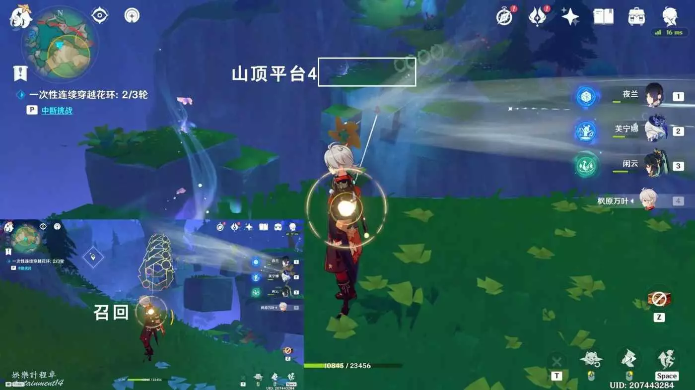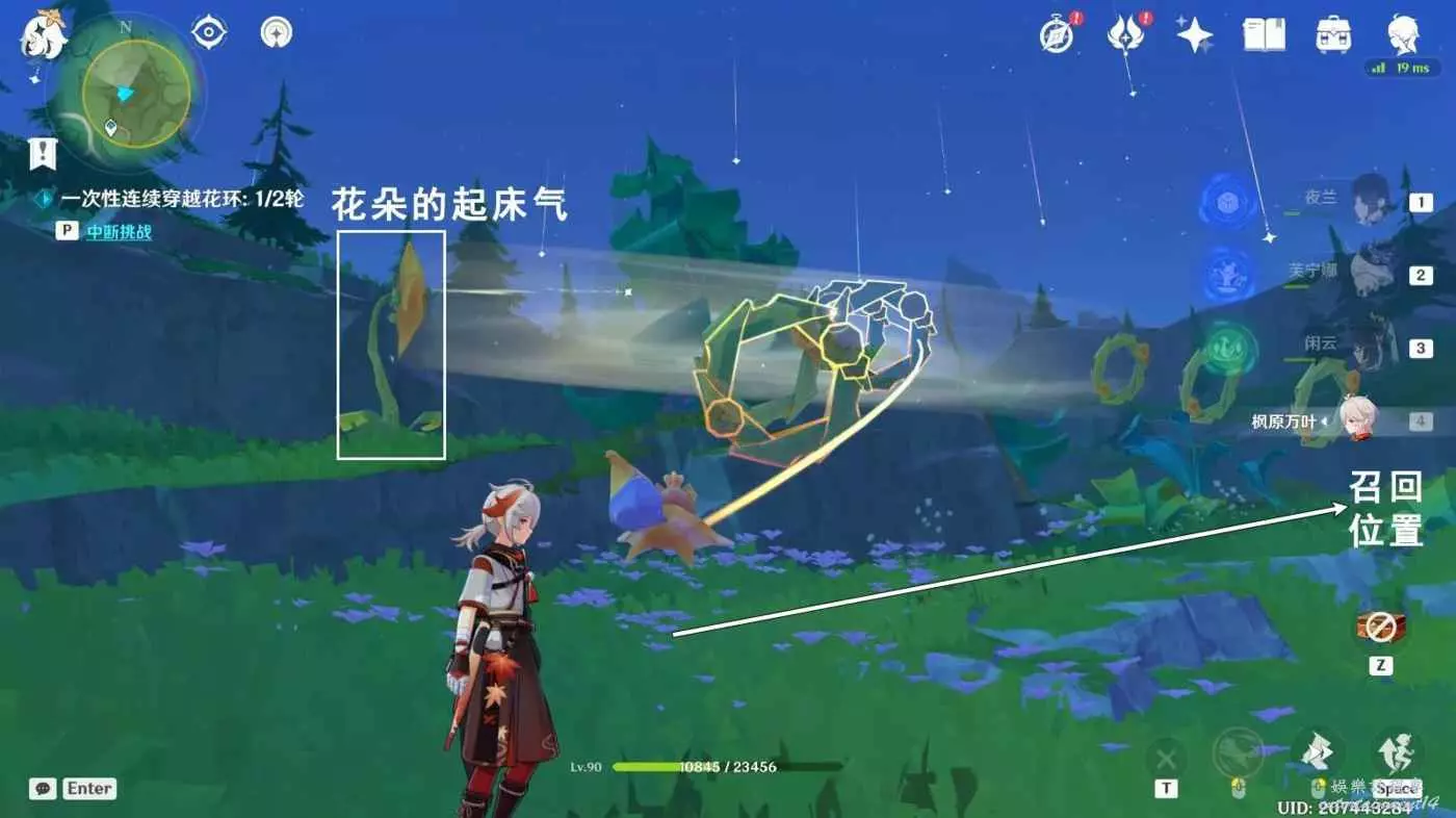 前往召回位置,顯示軌跡穿過所有花環,預判移動路徑點按攻擊召回;