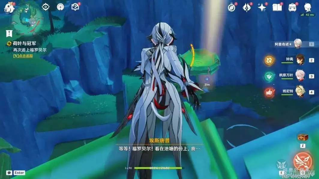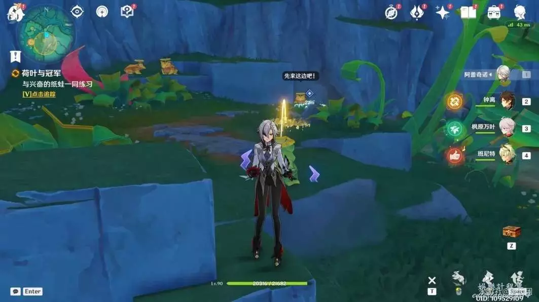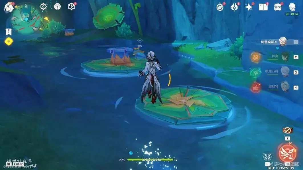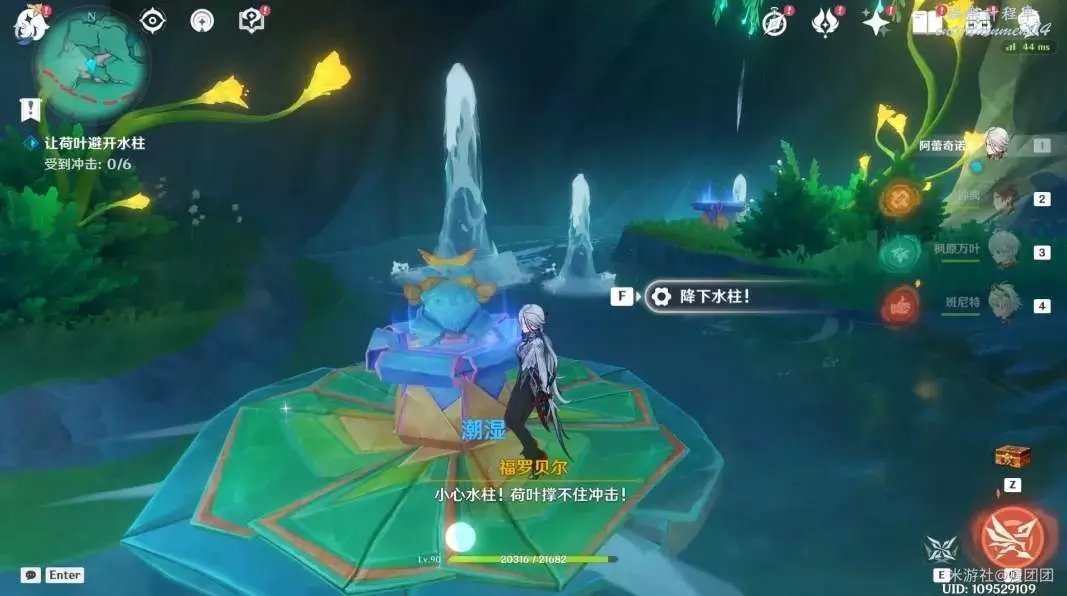 劇情過後和貝爾乘坐荷葉前進,靠近水柱時降下水柱。