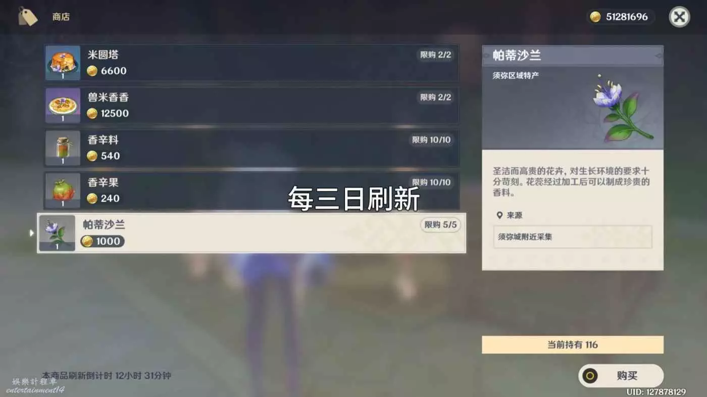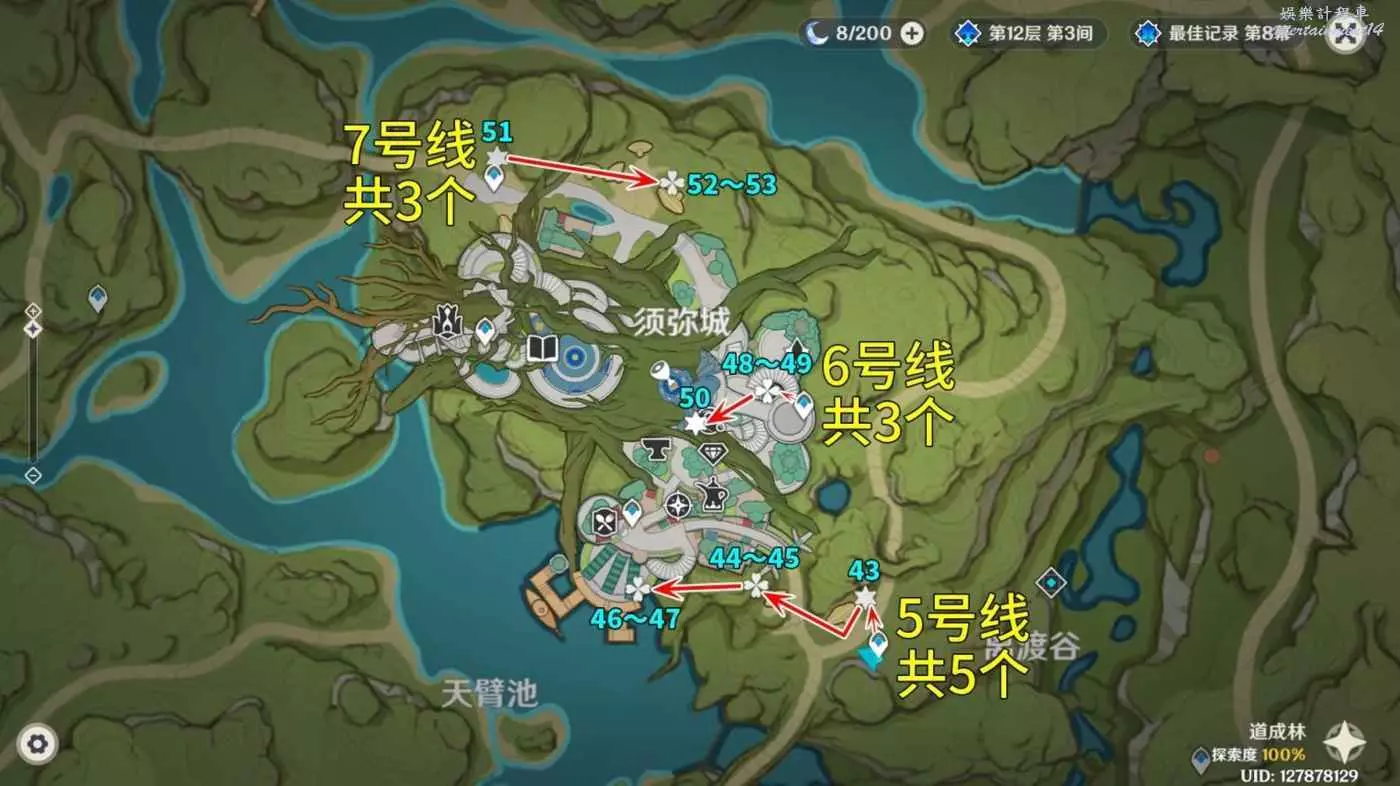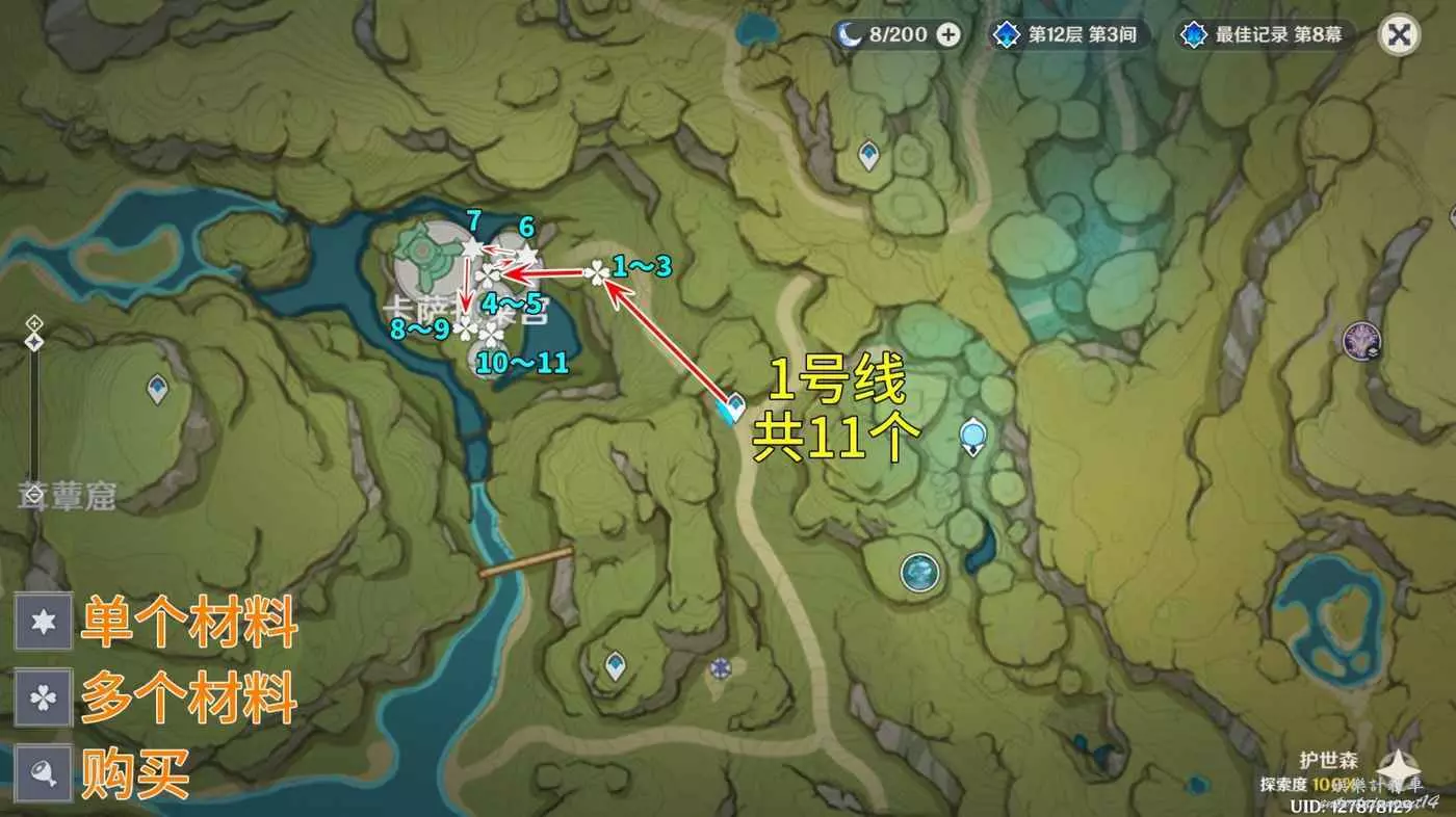 原神 (Genshin Impact) 4.8帕蒂莎蘭採集路線分享 18 7 月 2024-07-18 廣告 作者:君堓 來源:米遊社論壇 用途 特產刷新時間:48小時 標記特產角色:提納裡、賽索斯 推薦隊伍:雙風角色+提納裡/賽索斯+納西妲/跑圖角色 採集路線 1號線:共11個 2~4號線:共31個 5~7號線:共11個 8號線:共3個 9號線:共12個 商店購買 共5個(每三日刷新) 對話獲得 對話1:共4個(一次性) 對話2:共4個(一次性)