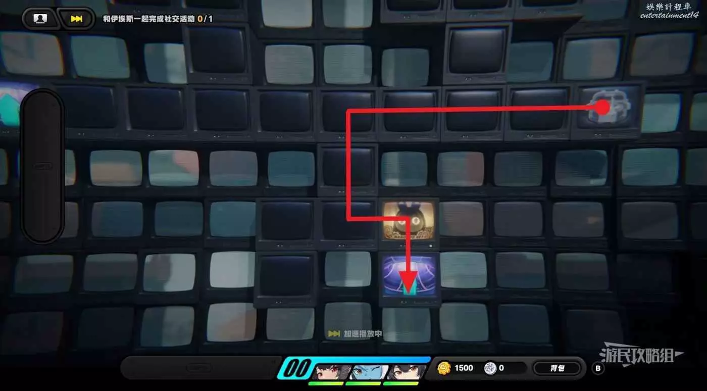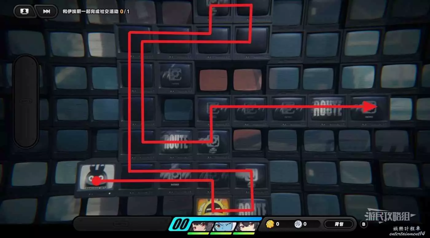 從黃色物資所在位置出發,往左上方走,把所有的格子都走完,拾取到3個丁尼和2個紫色物資。