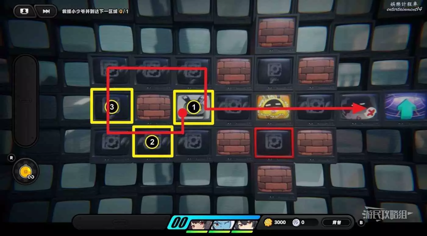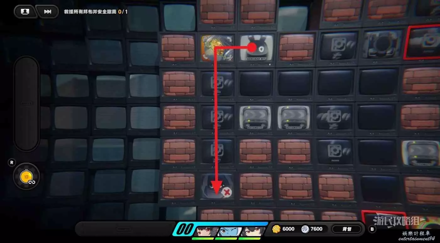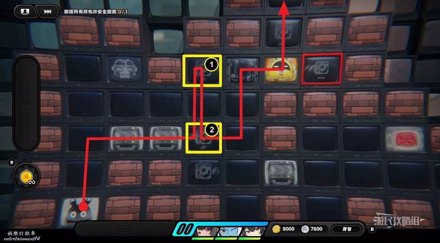 從隱藏區域回來之後,往左走一格並使用邦布插件,然後再走兩格使用邦布插件,往左下走使用第三次邦布插件,然後利用上方格子繞開黃金邦布,拾取區域左側的紫色物資。