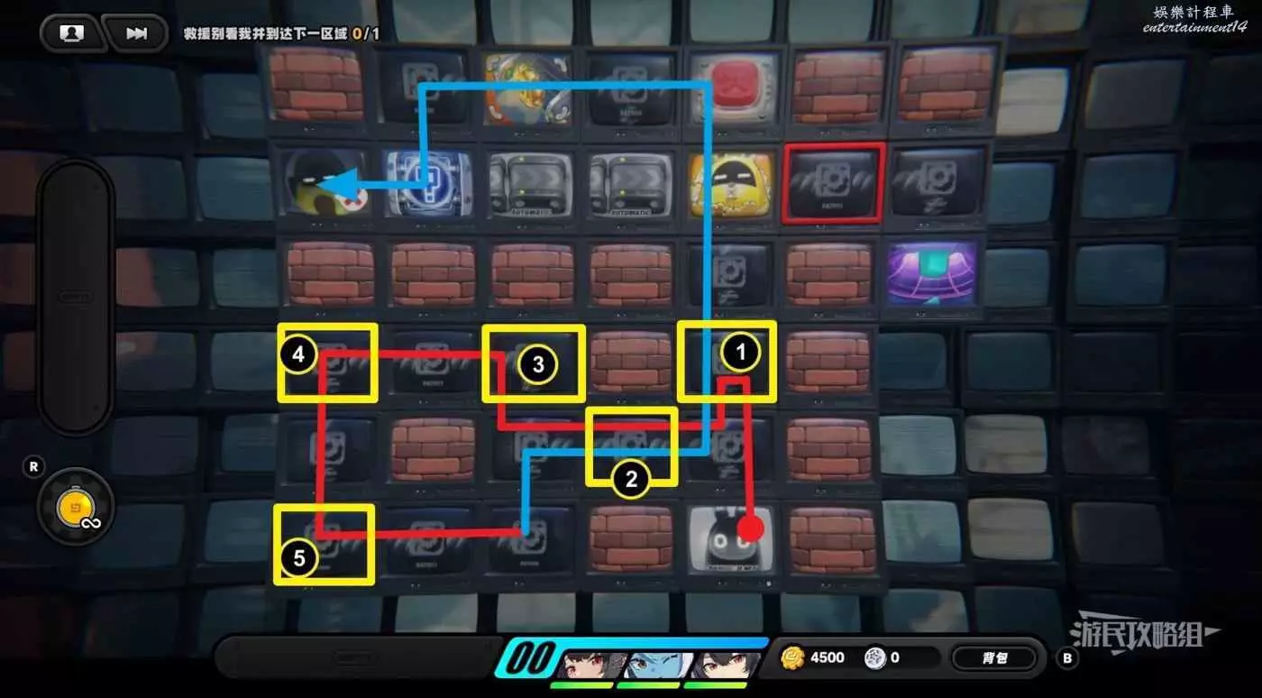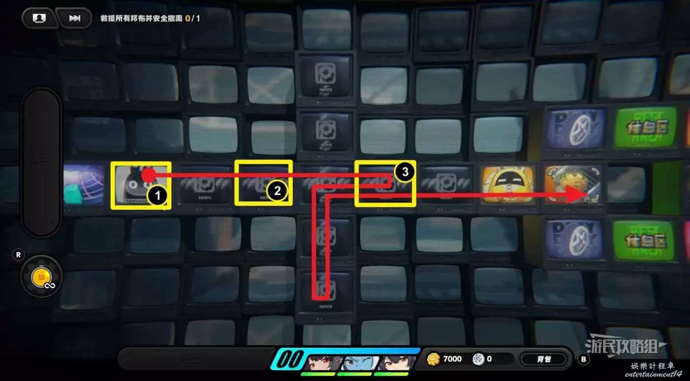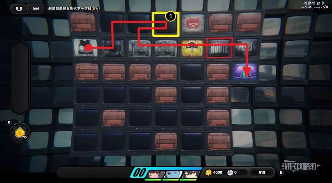 從隱藏區域回來之後,往左走一格並使用邦布插件,然後再走兩格使用邦布插件,往左下走使用第三次邦布插件,然後利用上方格子繞開黃金邦布,拾取區域左側的紫色物資。