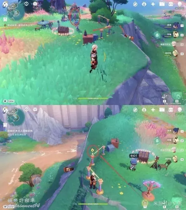 這裡通過角色攻擊發條使時光倒流,倒流當積木小人站在草坪上時,角色再通過互動鍵使魔線連結神諭柱即可完成,解鎖精緻寶箱。