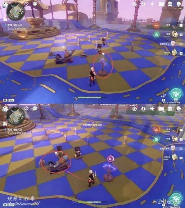 攻擊發條進行時光倒流,倒流到積木小人踩在機關上時停止,然後角色攻擊旁邊的膠水裝置即可完成回溯捉拿可疑人員。