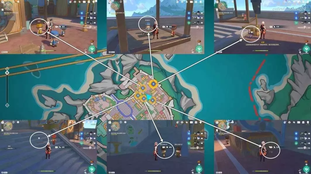 按圖中指引,前往6處位置調查和對話