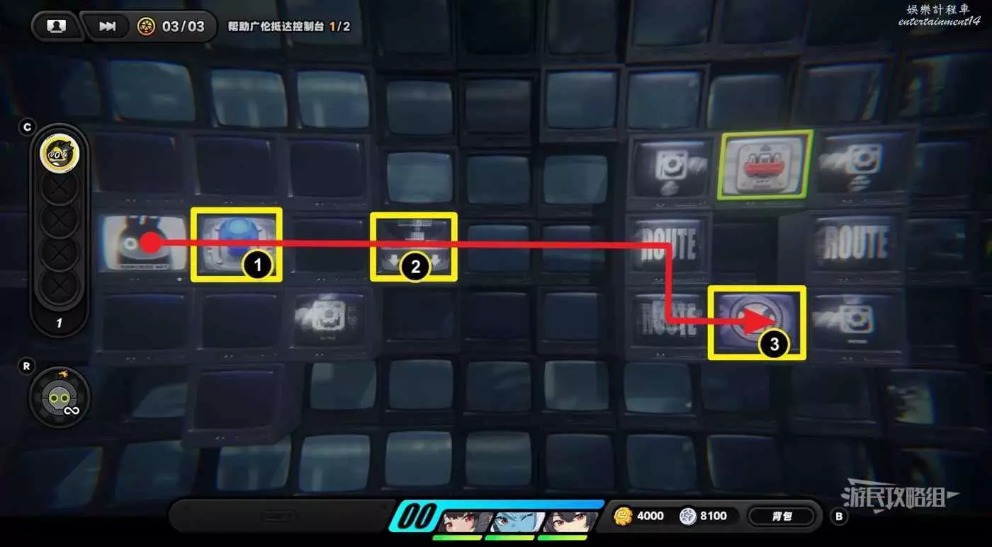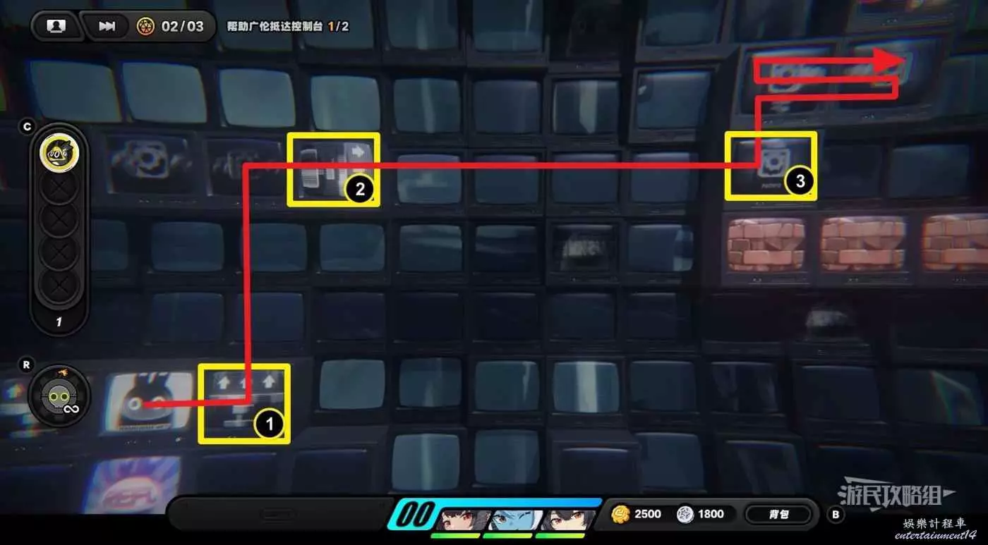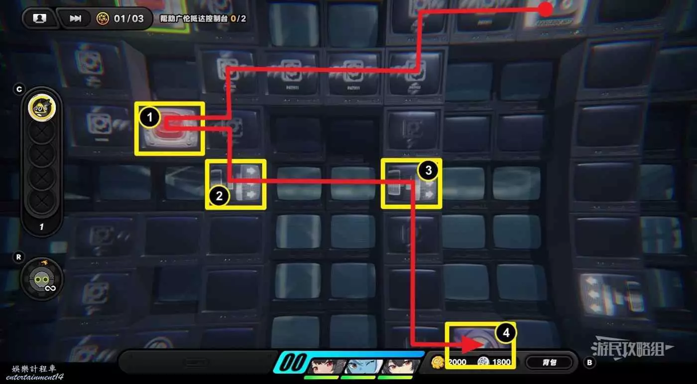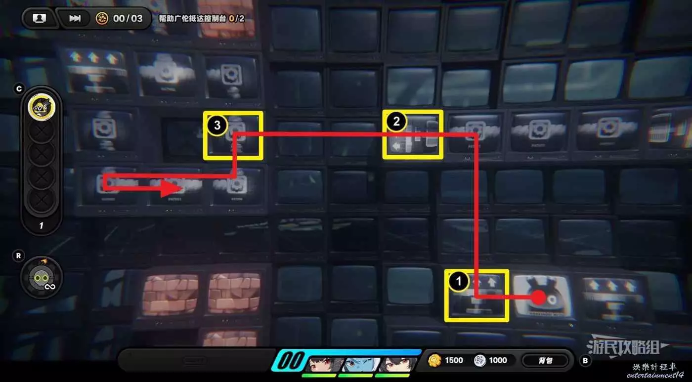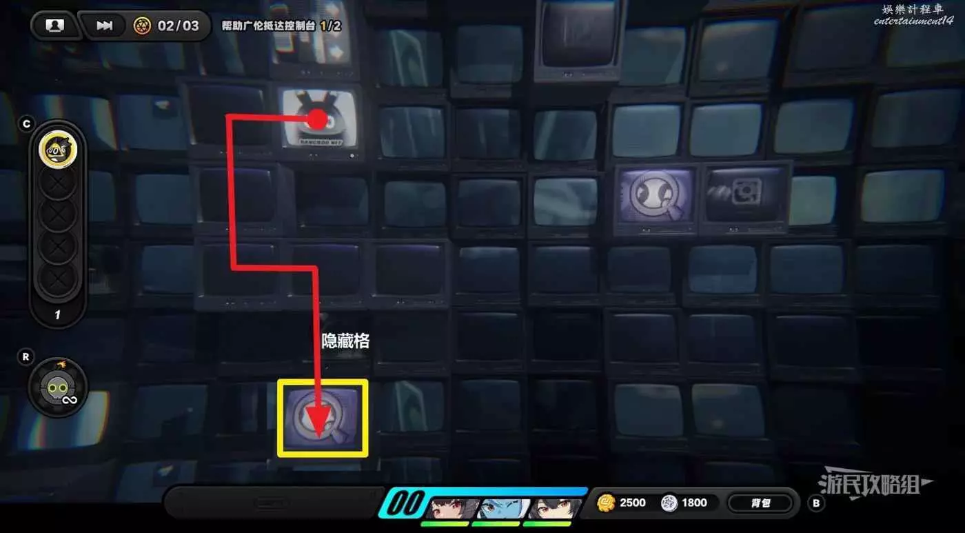 進入放大鏡圖示開啟的隱藏區域,沿路走拾取齒輪硬幣,再與盡頭的放大鏡圖示互動,左側又會開啟新的隱藏格子,在隱藏格子最左側有丁尼。拾取丁尼後沿路返回到放大鏡所在位置,往上走與控制台互動(下圖③的位置),選擇【呼喚】讓廣倫來操作控制台。