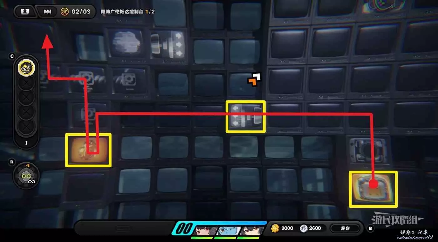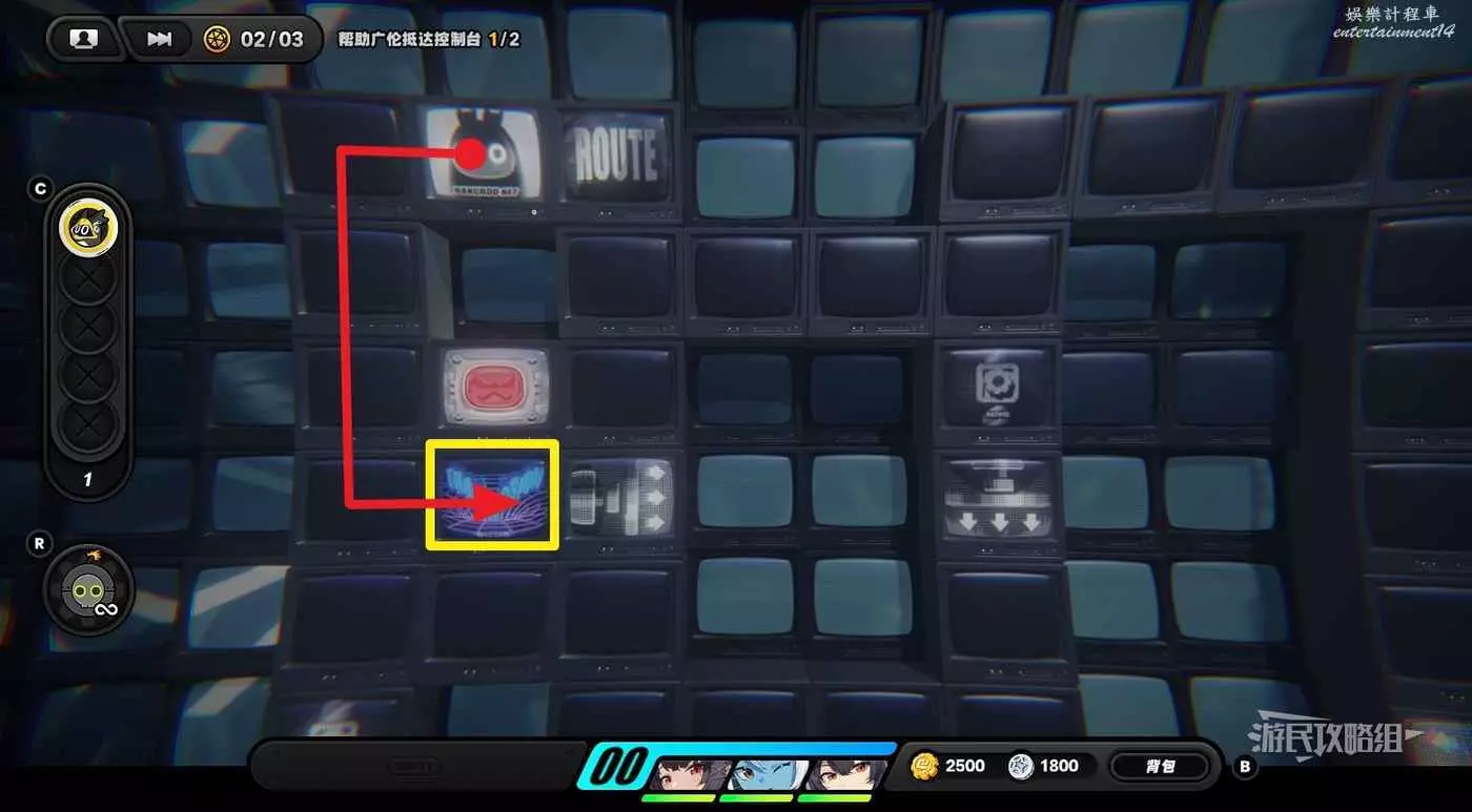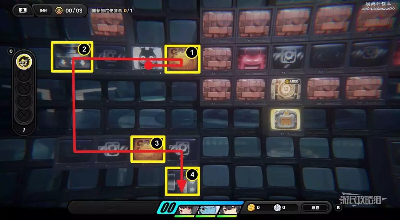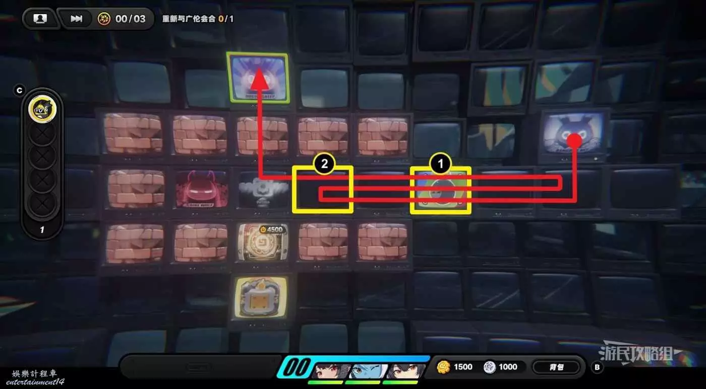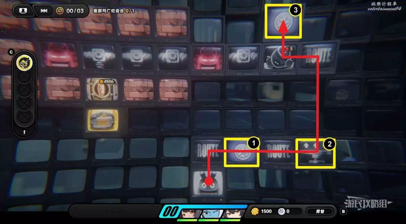 進入放大鏡圖示開啟的隱藏區域,沿路走拾取齒輪硬幣,再與盡頭的放大鏡圖示互動,左側又會開啟新的隱藏格子,在隱藏格子最左側有丁尼。拾取丁尼後沿路返回到放大鏡所在位置,往上走與控制台互動(下圖③的位置),選擇【呼喚】讓廣倫來操作控制台。