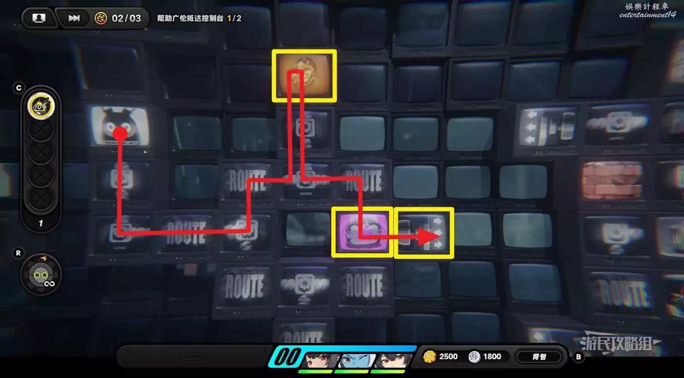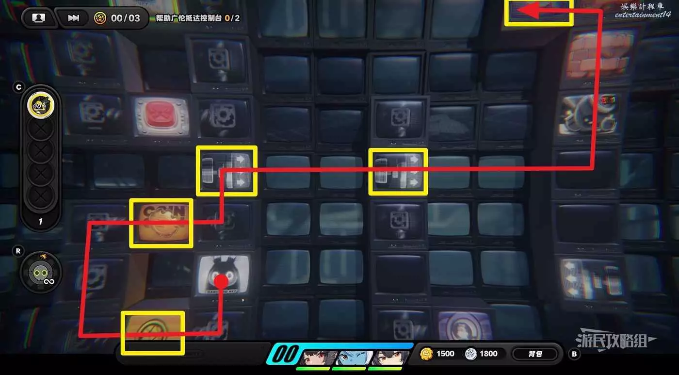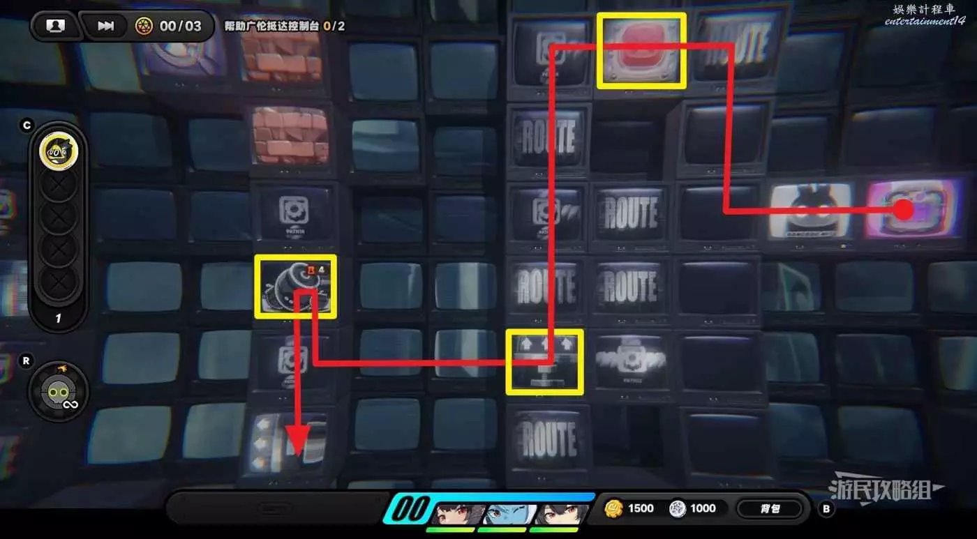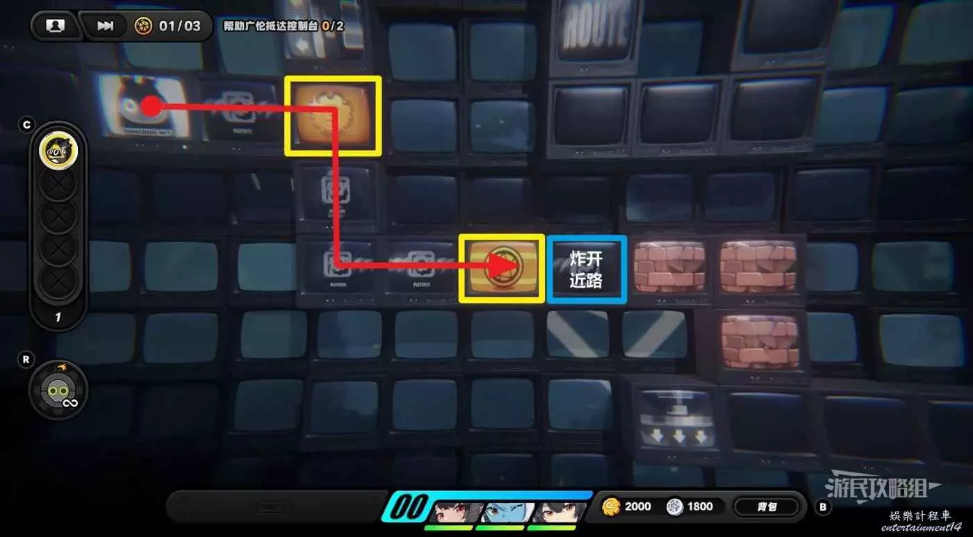 與放大鏡圖示互動後,右側會出現新的路,拾取路上的齒輪硬幣和觀測資料。如下圖所示籃框處可以使用炸彈炸掉磚塊,可以開一條近路,如果後面走錯路的話可以從這裡快速返回。