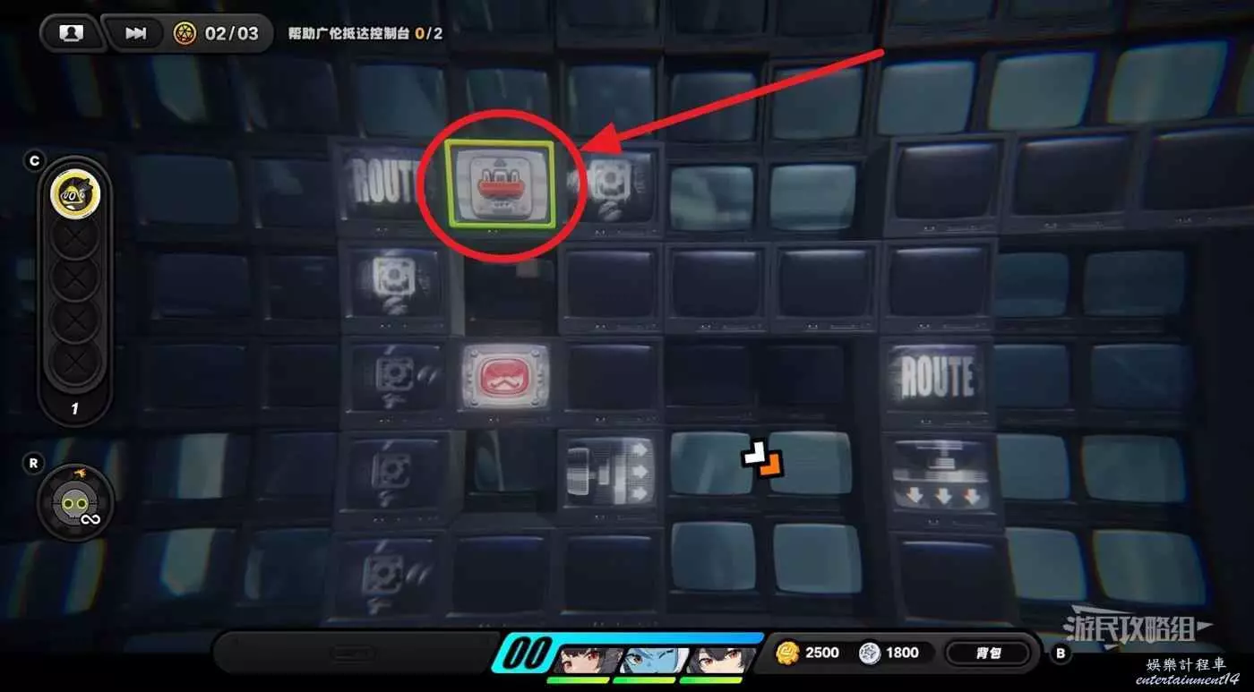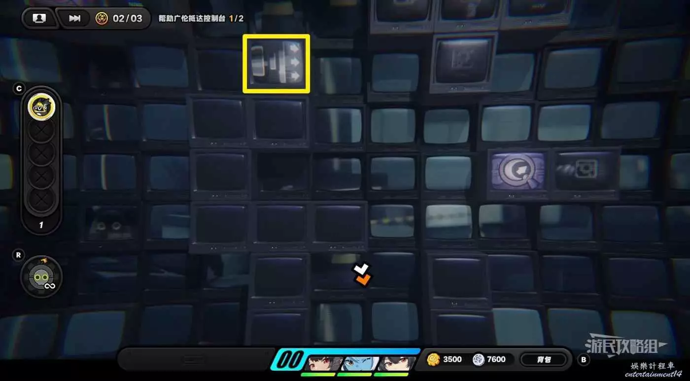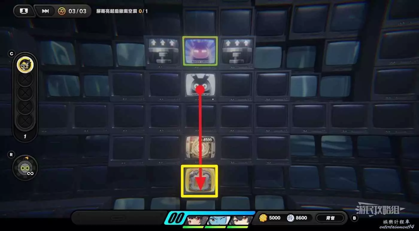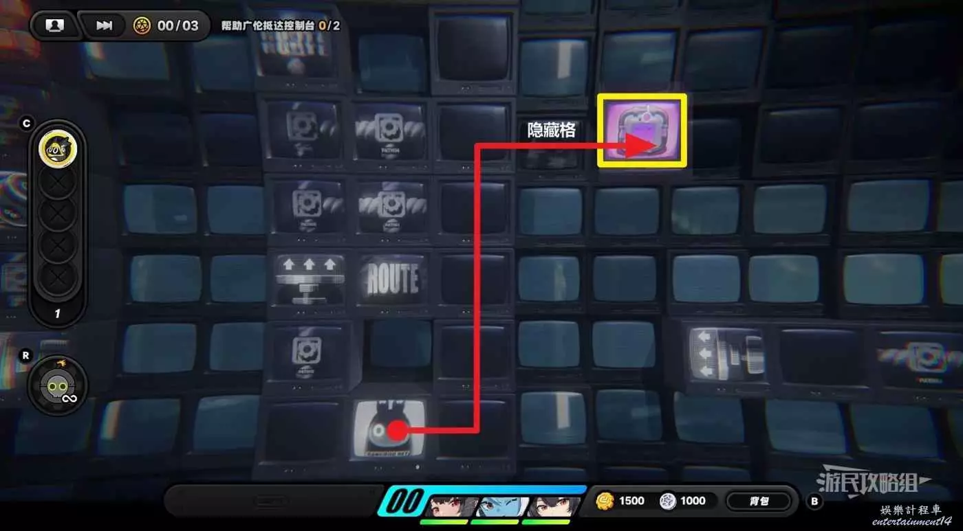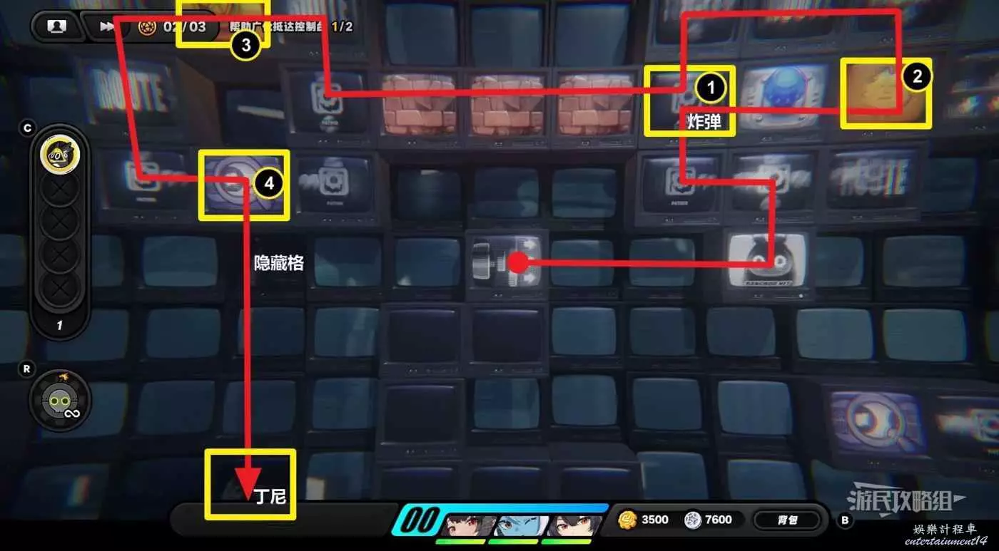 使用彈簧彈到右側區域,往左上方走,在藍色按鈕旁邊的格子裡放一個炸彈,然後踩著藍色按鈕往右拾取齒輪硬幣,再往上走一格,往左走一格讓炸彈爆炸。炸掉磚塊後,沿著磚塊所在通道往左走,拾取上方的觀測資料,和下方的放大鏡圖示互動,放大鏡圖示下方有一列隱藏格子,往下走4格可以拾取隱藏的丁尼。