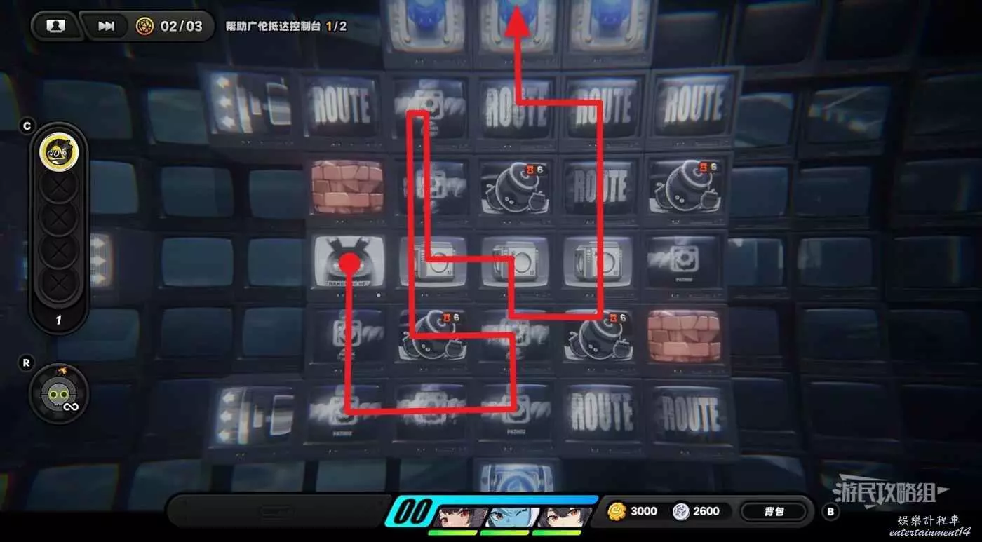 然後往下往左走拾取炸彈,拾取炸彈後往左走兩格,放置炸彈,往右走4格躲避炸彈,炸彈炸掉以骸和磚塊後,往上走與廣倫會合。