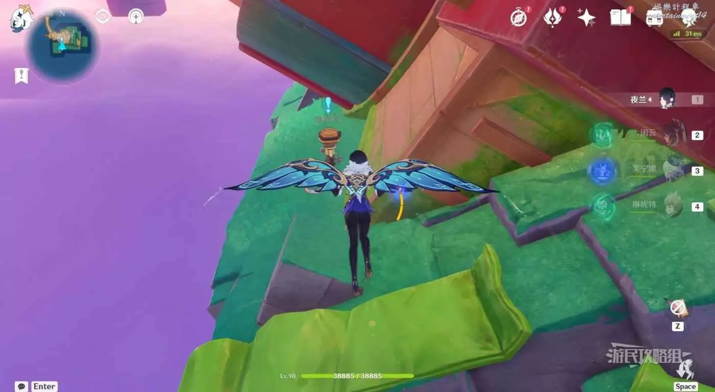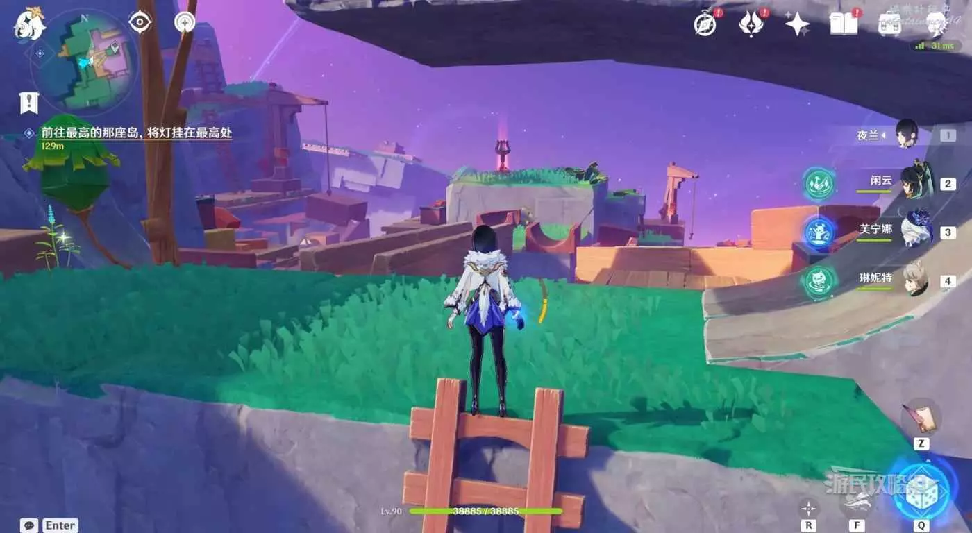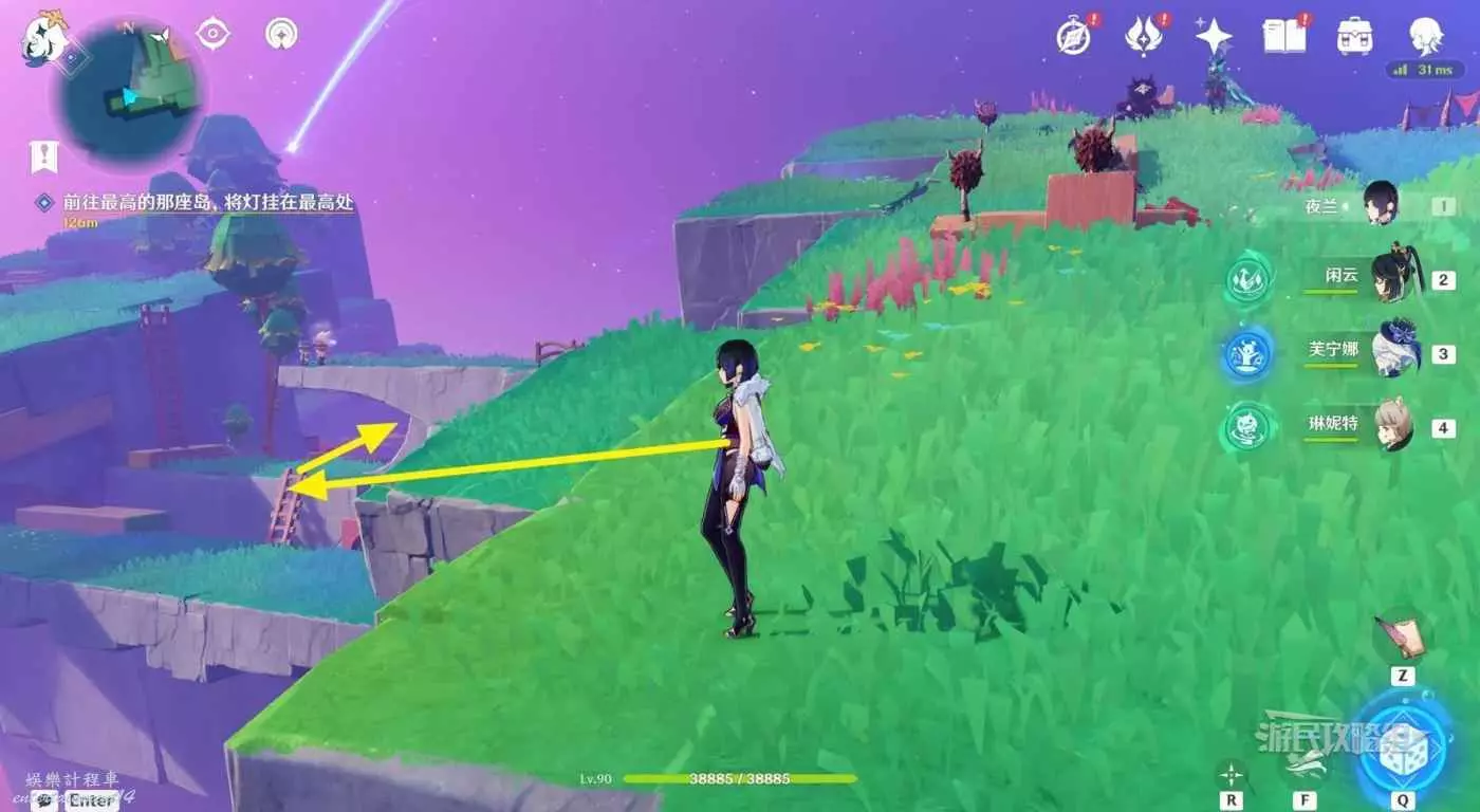 往傳送錨點的東方向看(小地圖右邊),下方對面可以看到一個木梯子,跳到木梯子所在的那層。